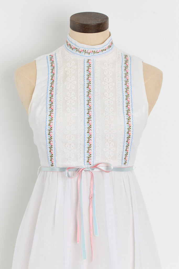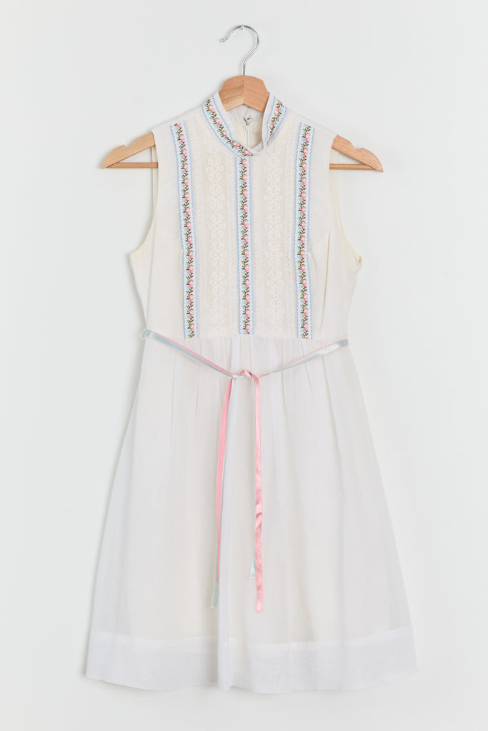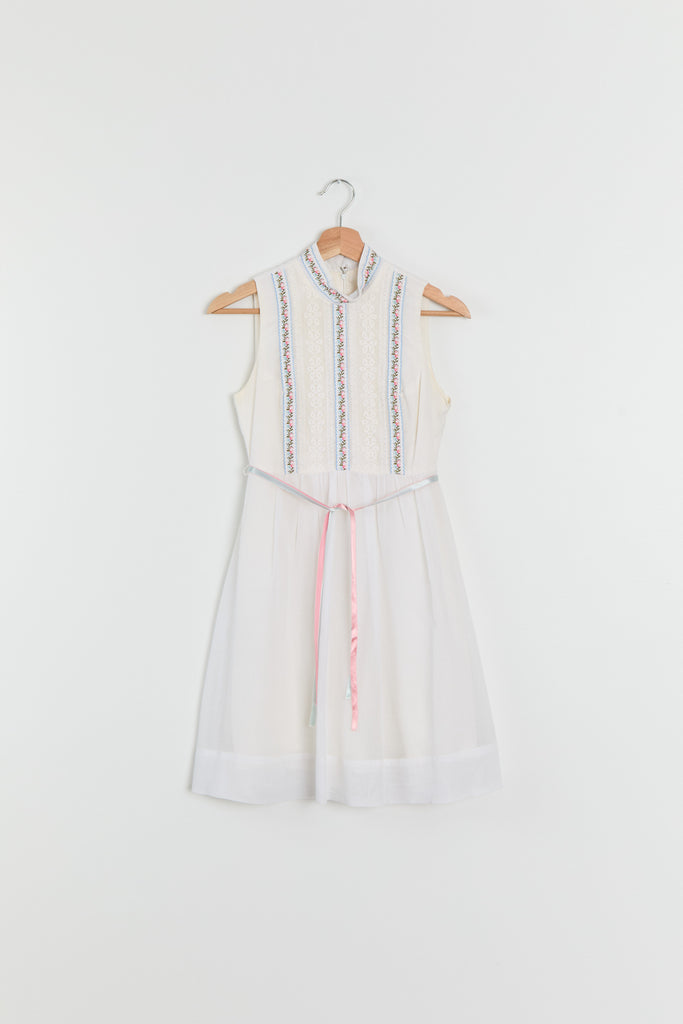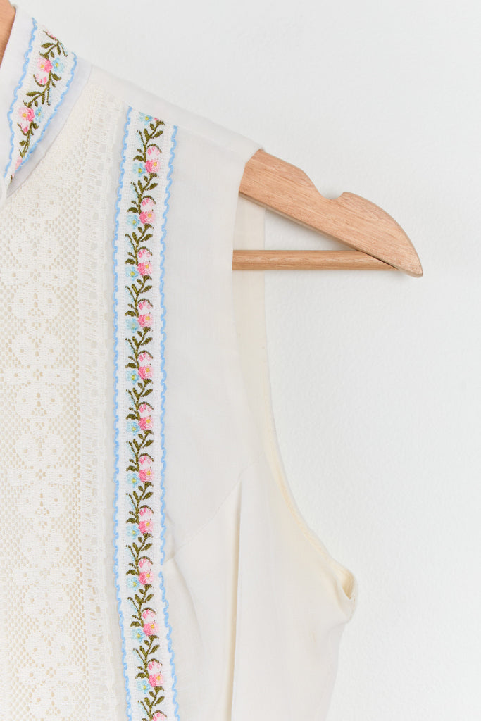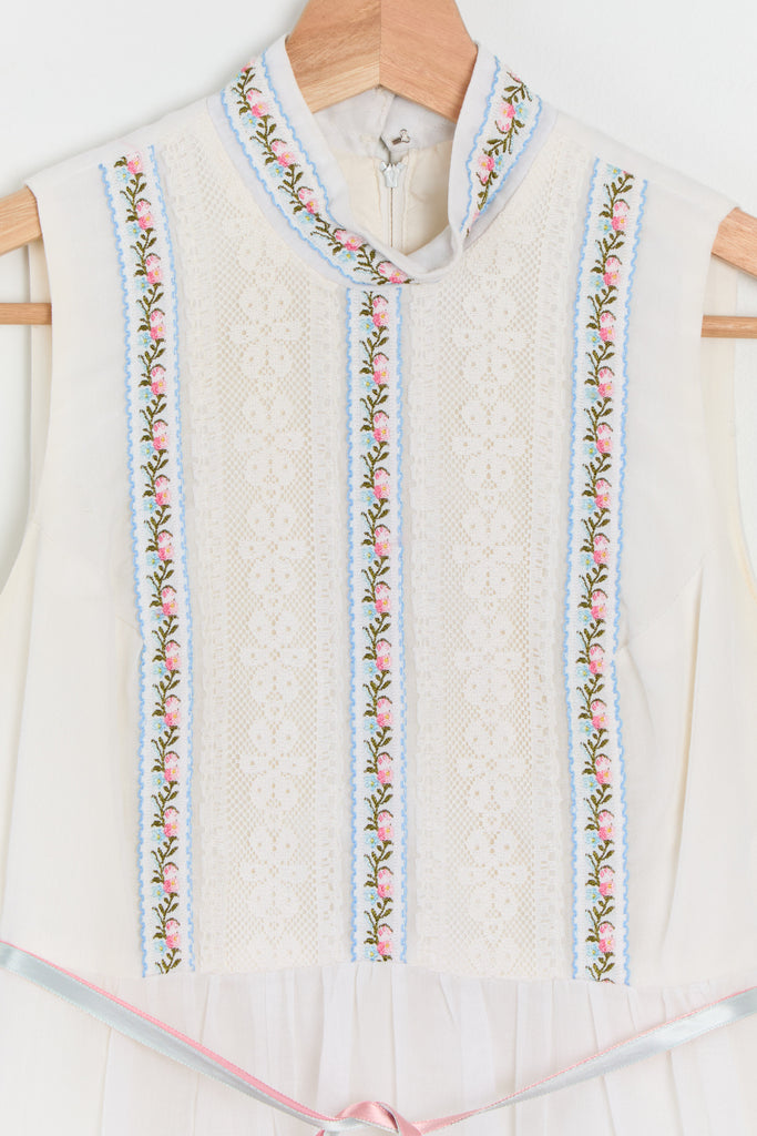 60s Cream Embroidered Lace Bodice Mini Dress XS