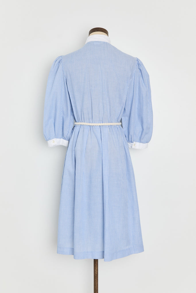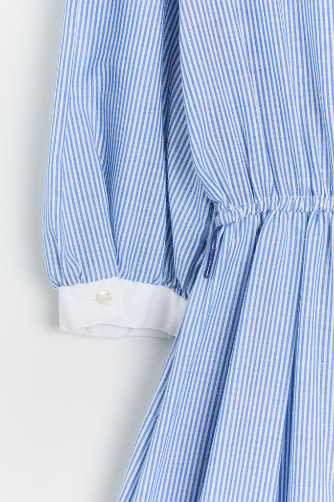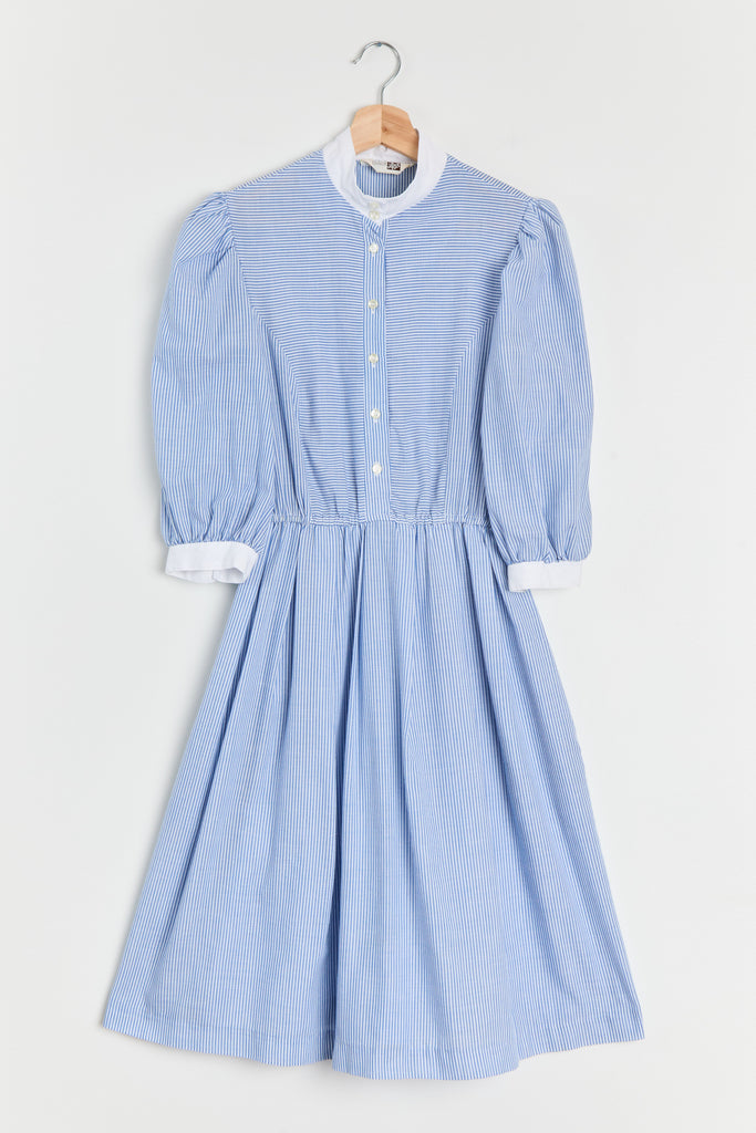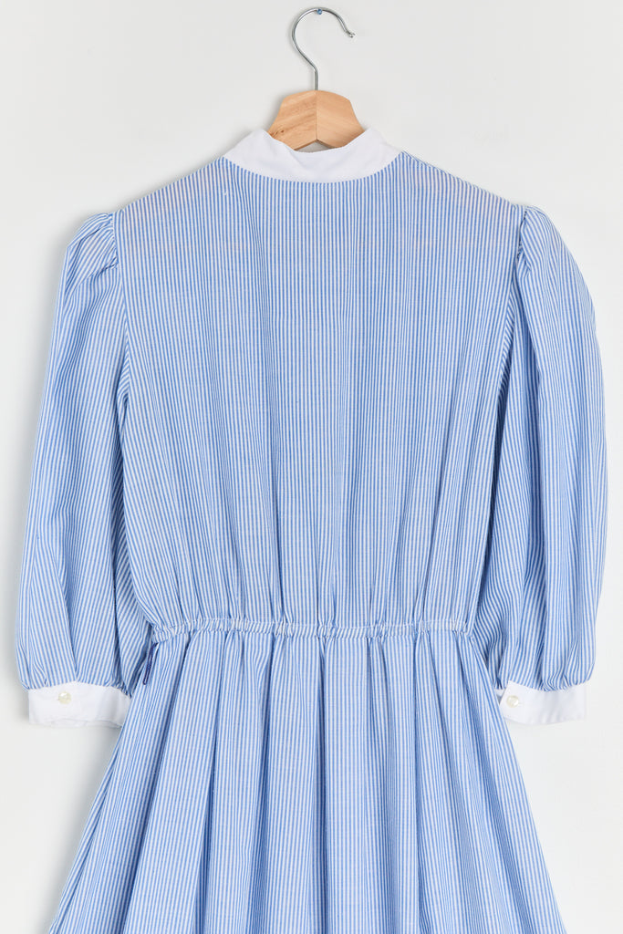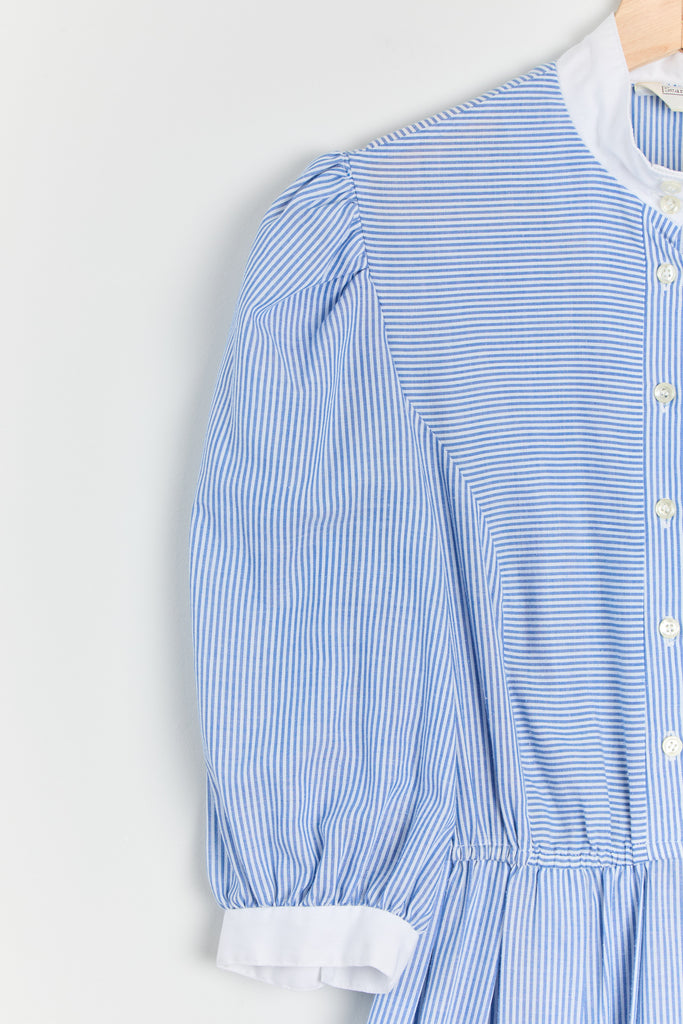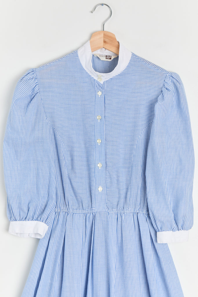 70s Blue White Striped Puff Sleeve Shirt Dress S/M