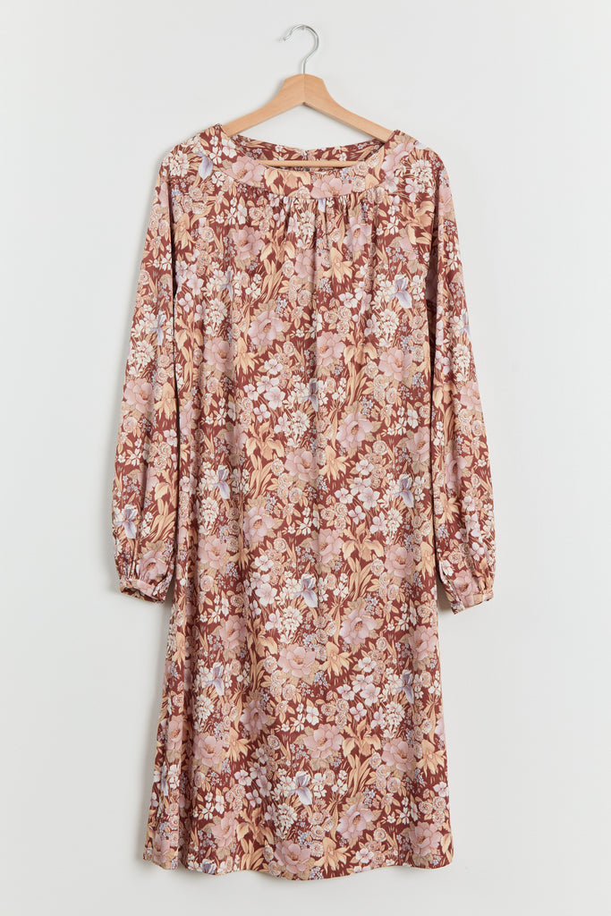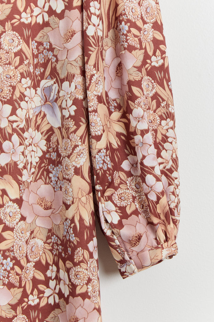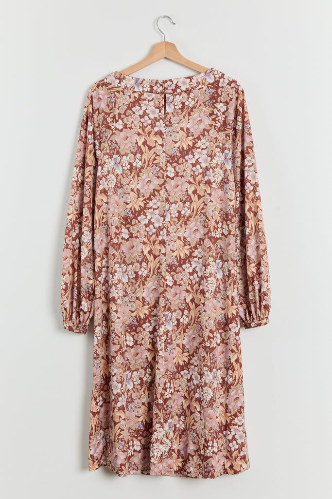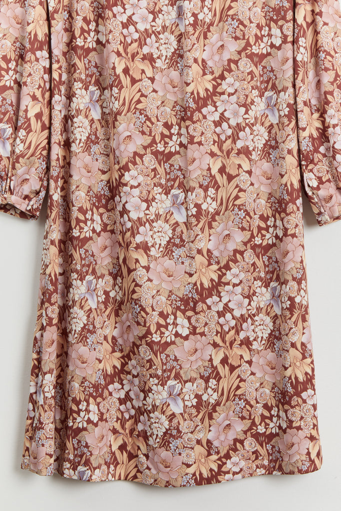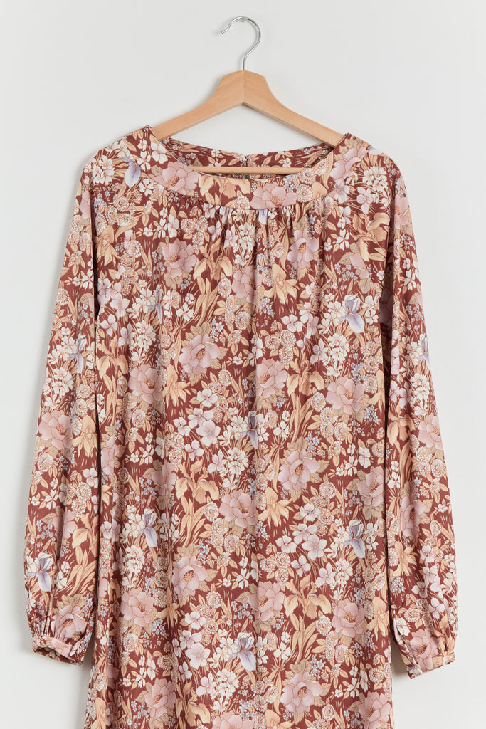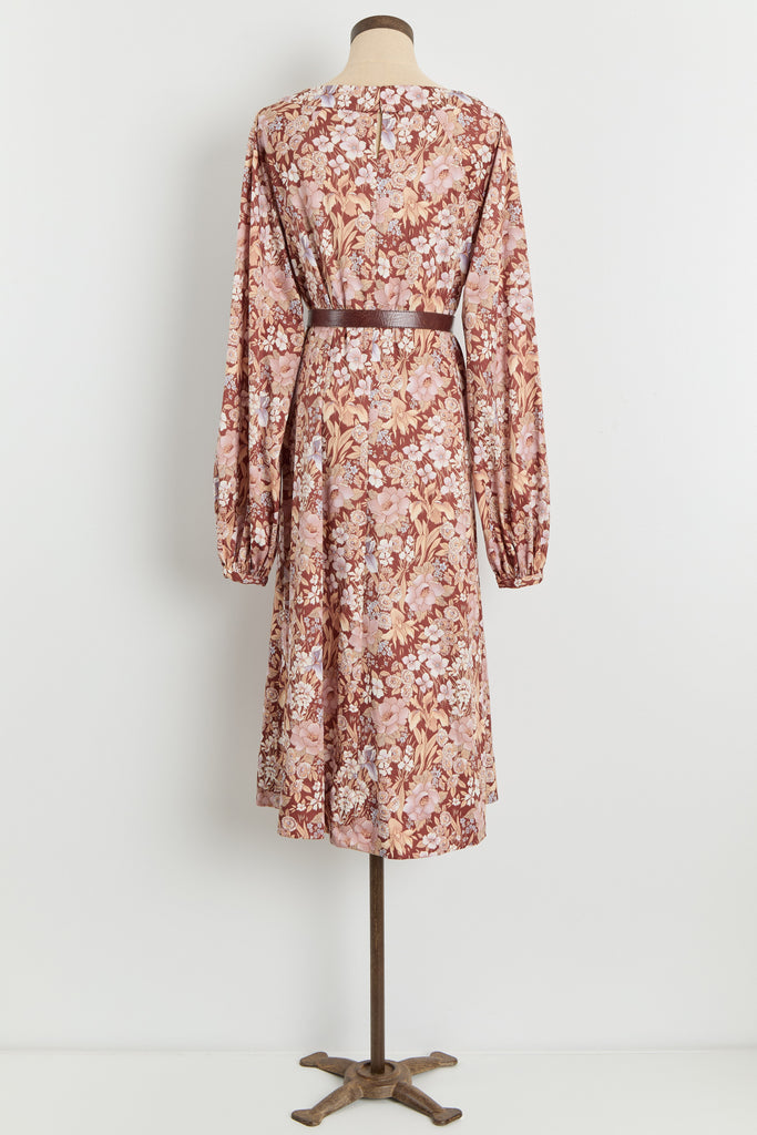 70s Brown Floral Print Polyester Shirt Dress L