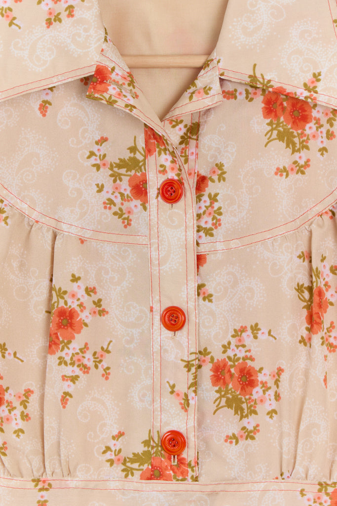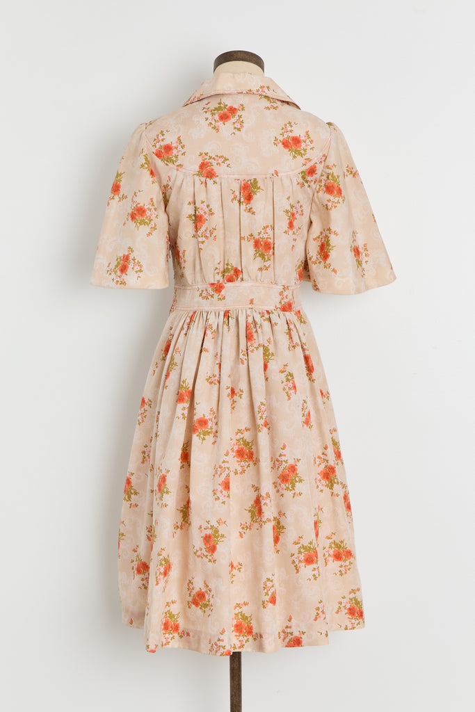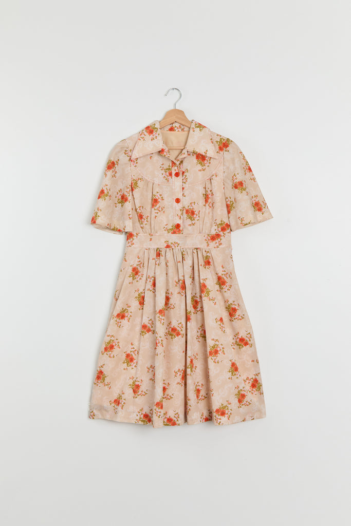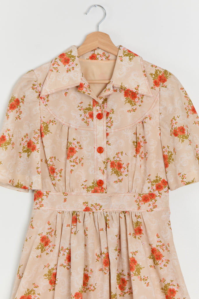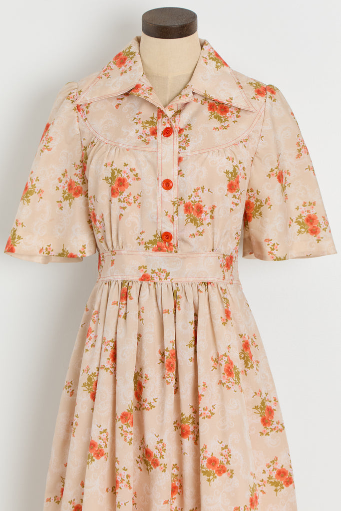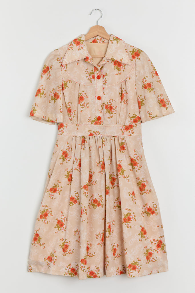70s Sherbet Orange Floral Shirt Dress M