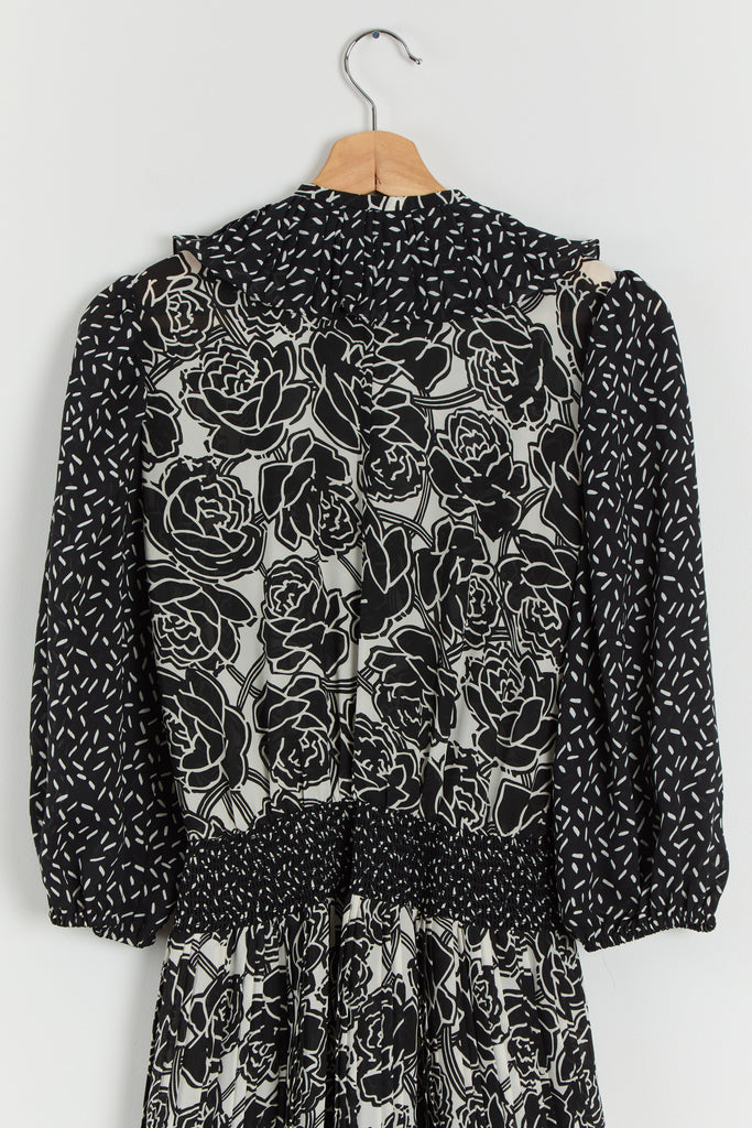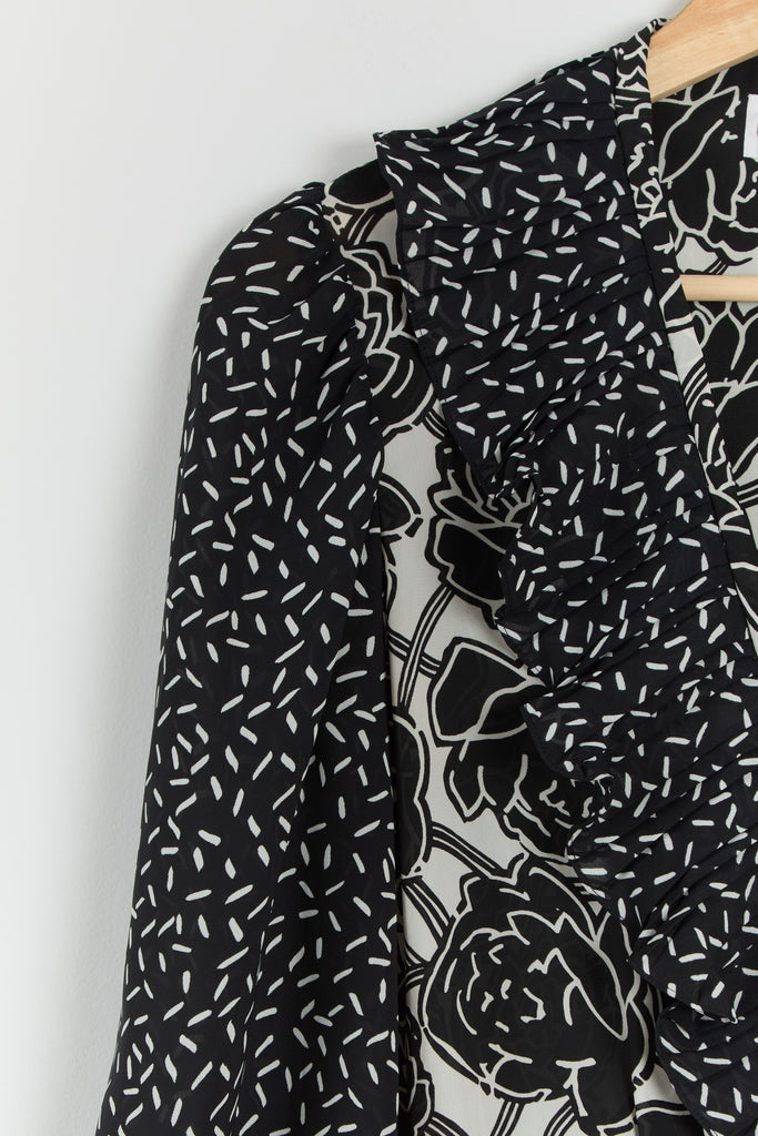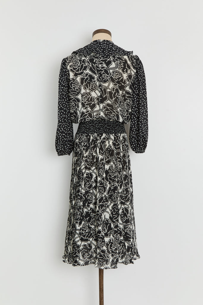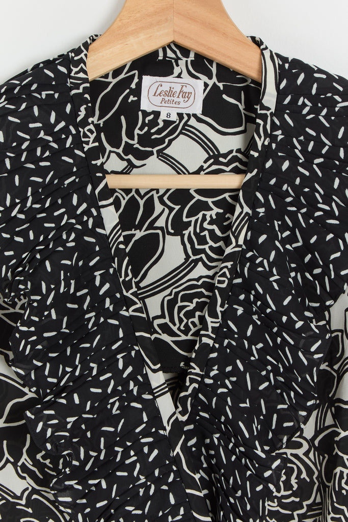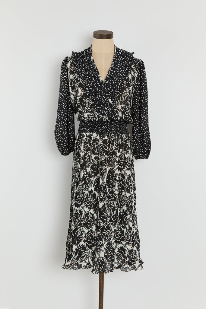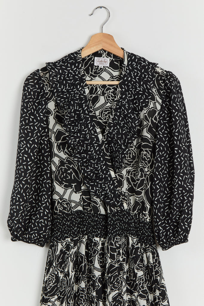 80s B&W Floral Ruffle Chiffon Dress M/L