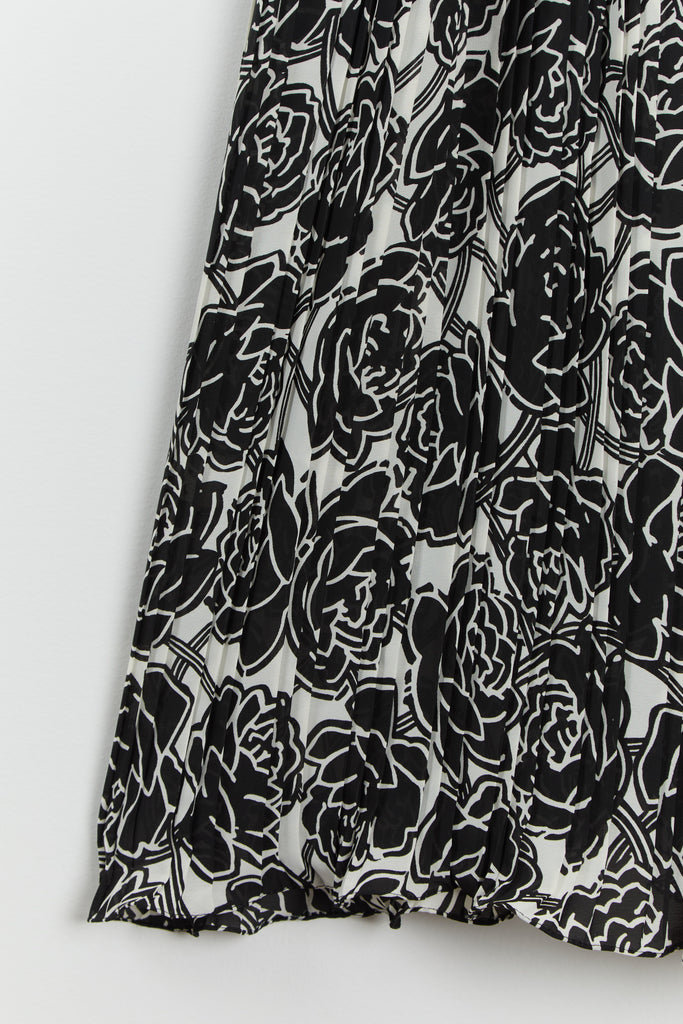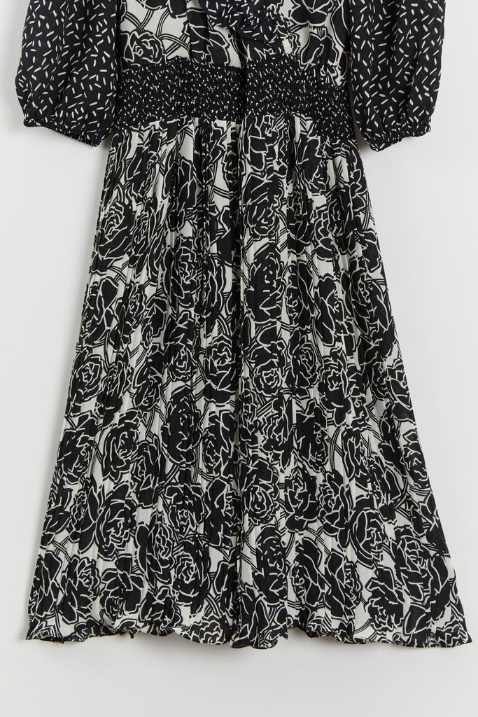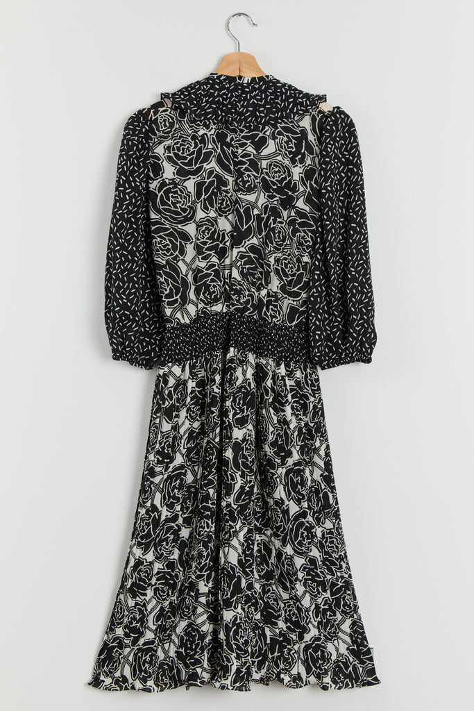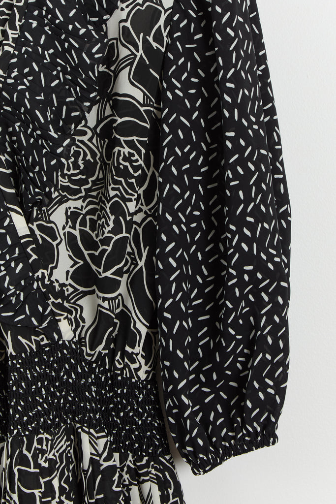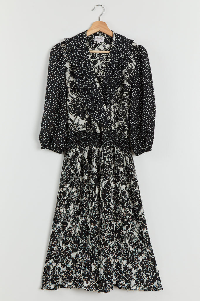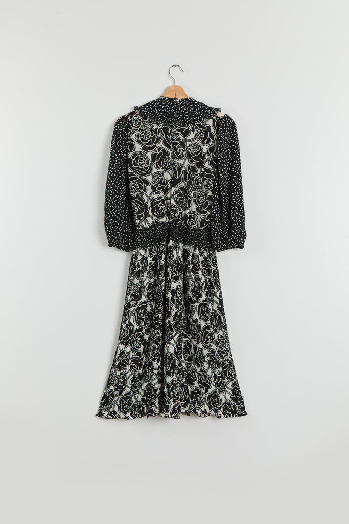 80s B&W Floral Ruffle Chiffon Dress M/L