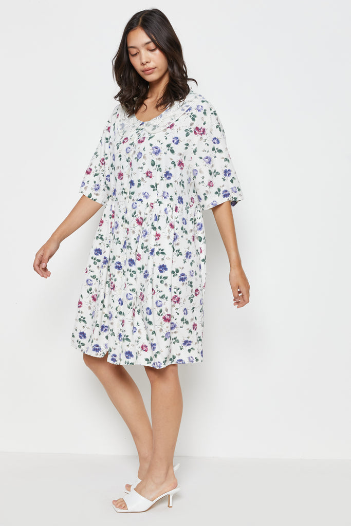 80s Cream Lace Lapel Floral Dress L