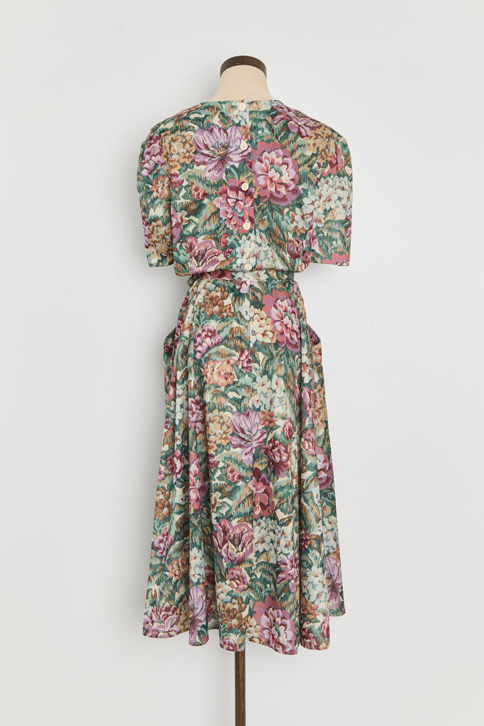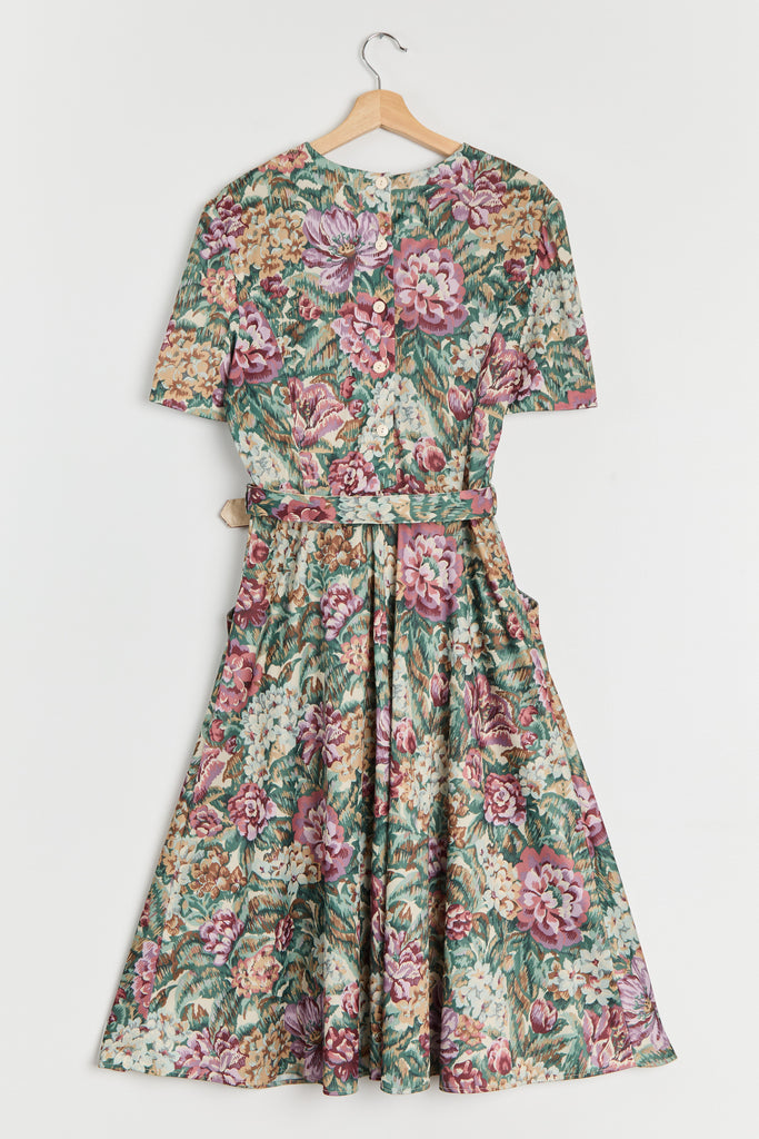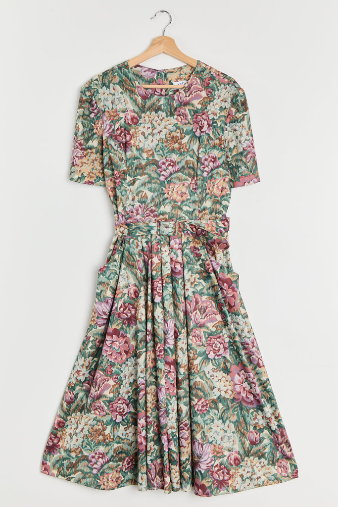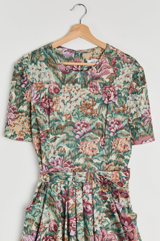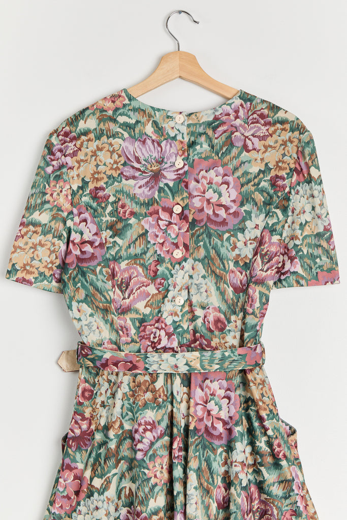 80s Forest Magenta Floral Print Knit Belted Dress L