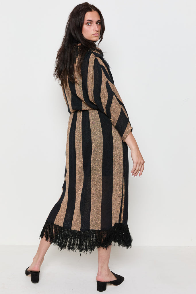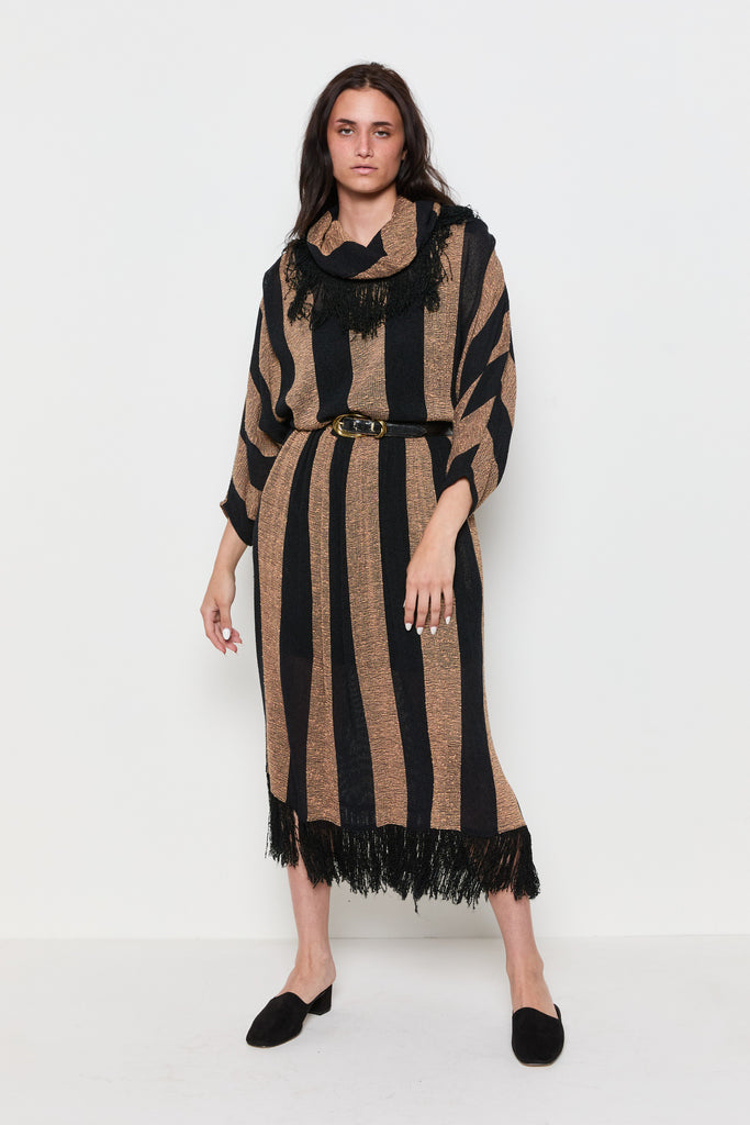 80s Tan Black Striped Fringe Trim Cowl Dress L