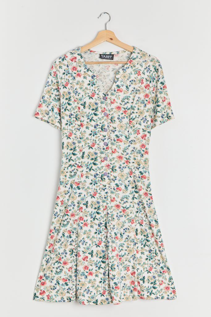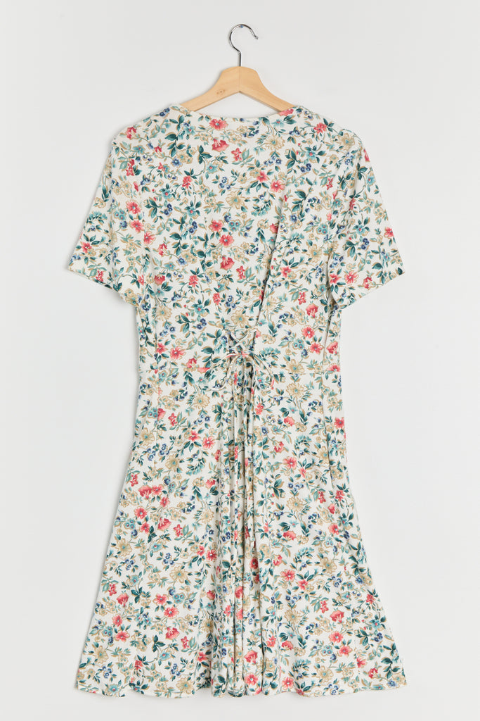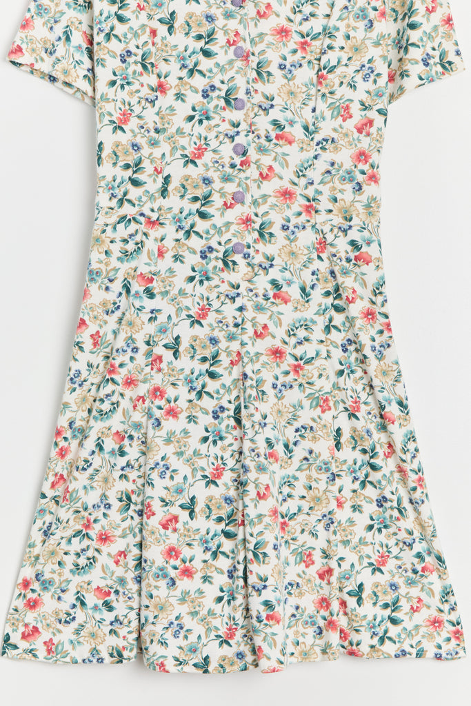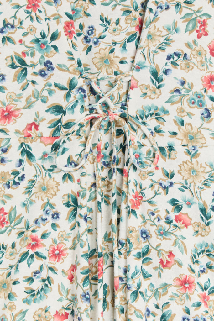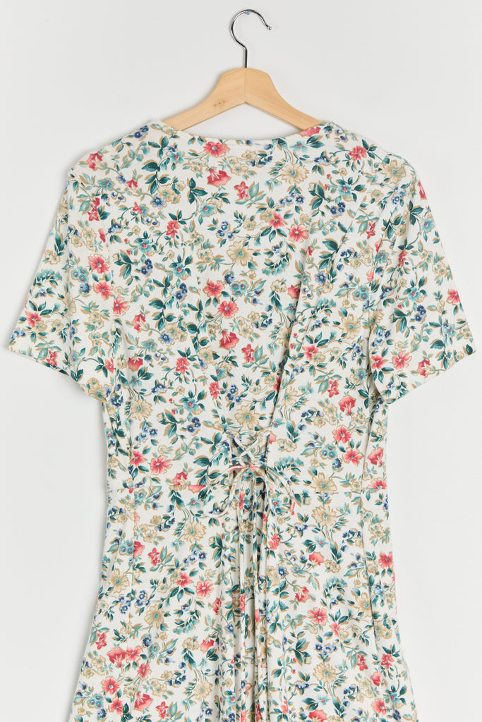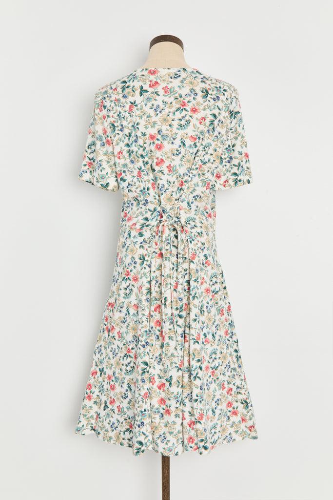 80s White Floral Knit Lace Up Dress L