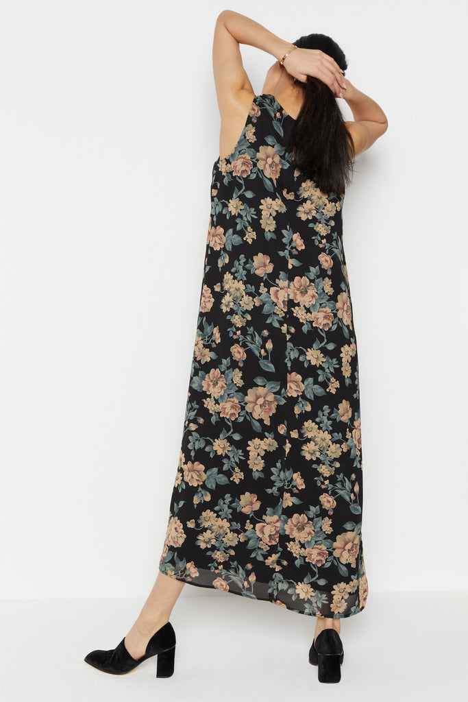 MATERIAL / N/A, feels like polyester, lightweight sheer floral chiffon layered over black solid lining, fully lined