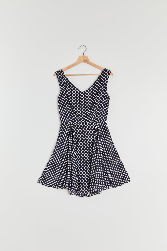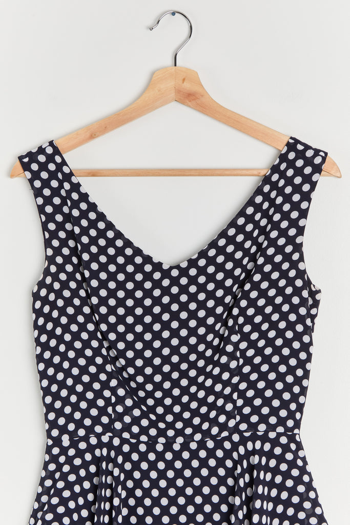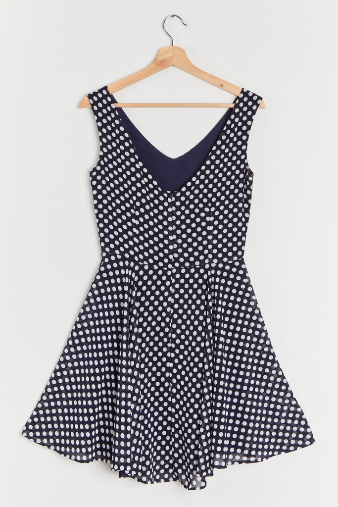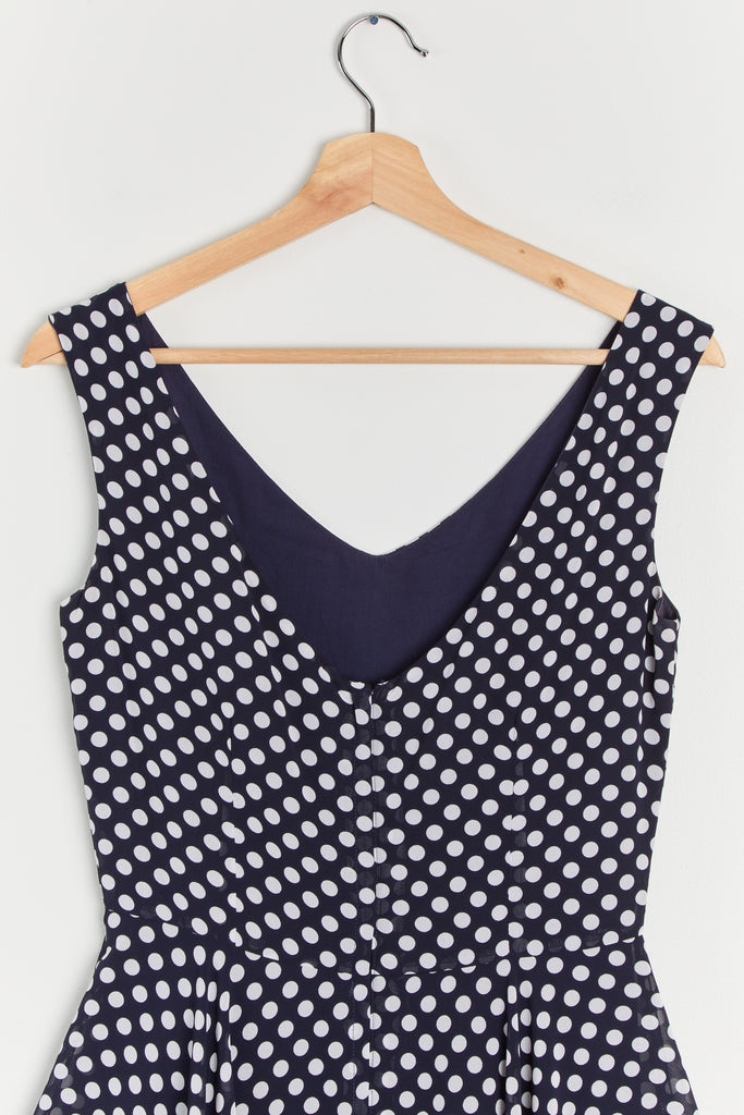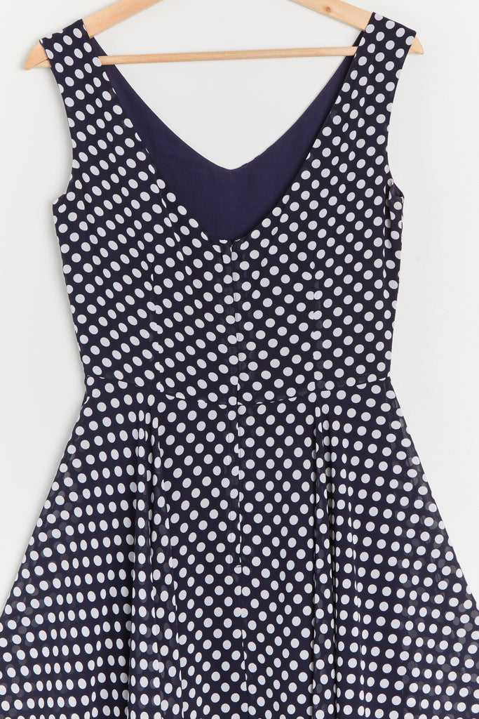 90s Navy White Chiffon Polka Dot Fit & Flare Dress S