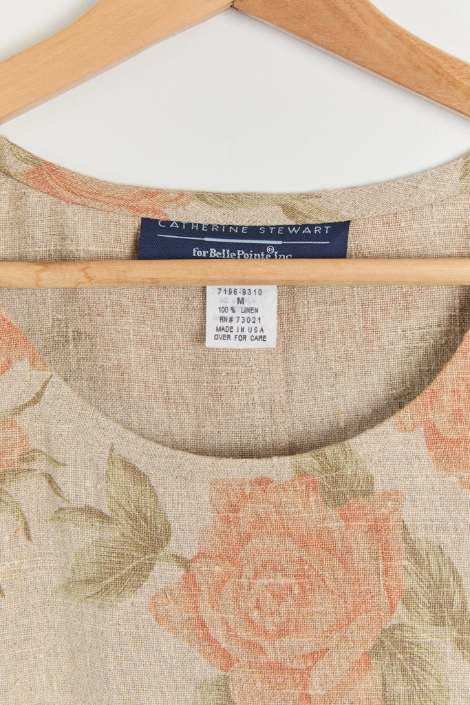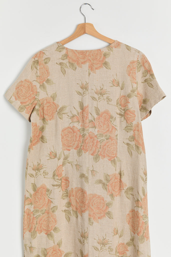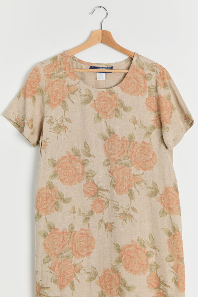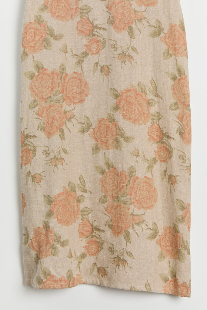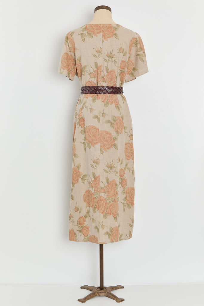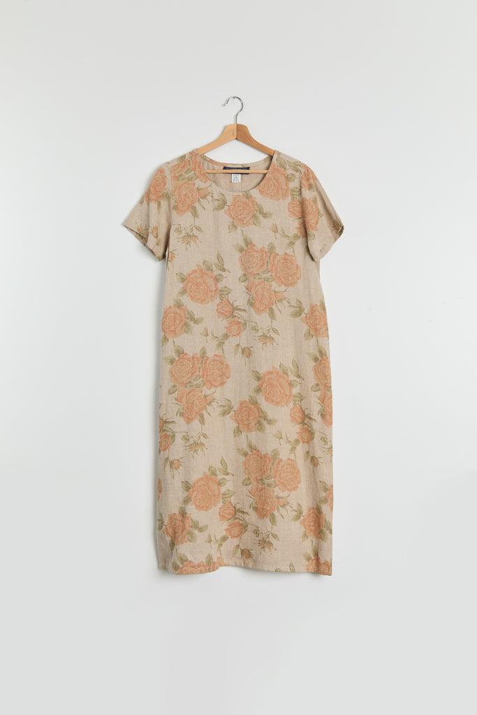 90s Taupe Orange Floral Print Linen Dress M/L