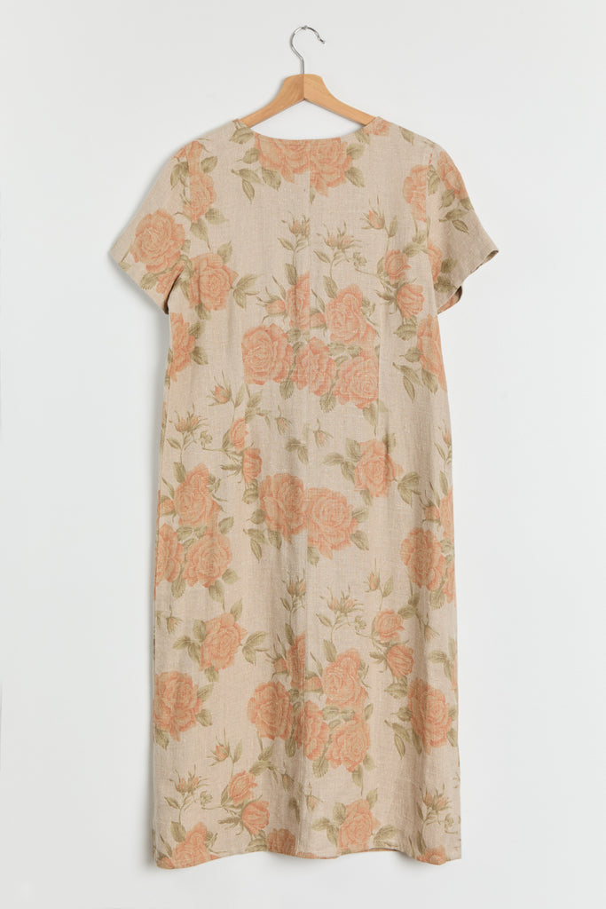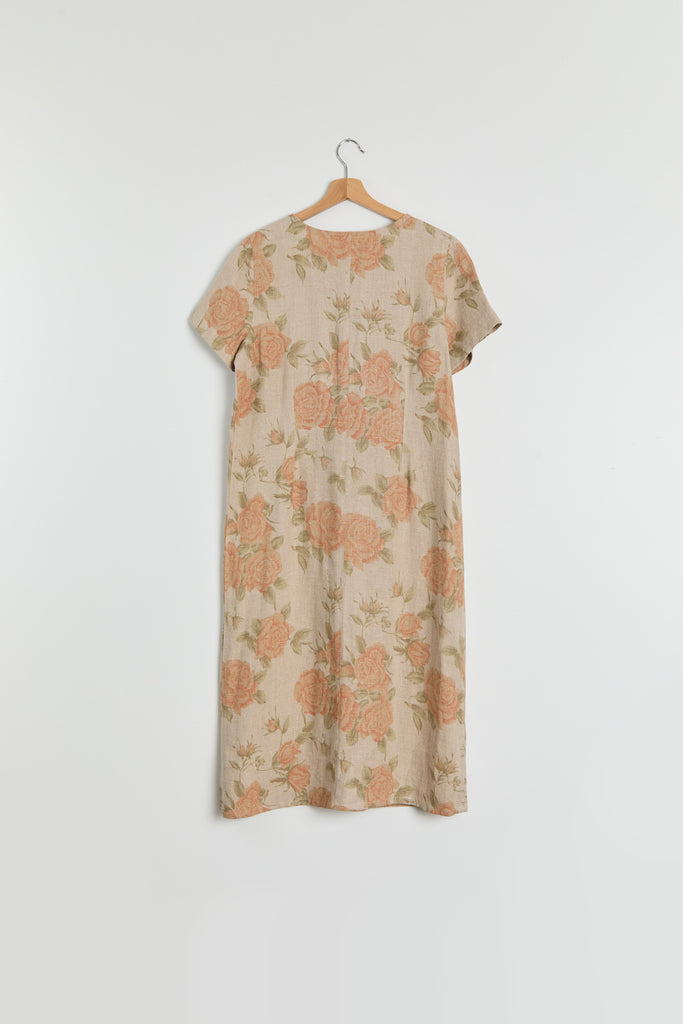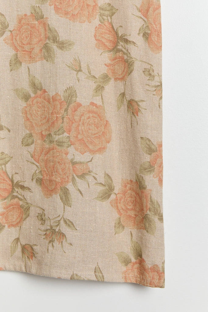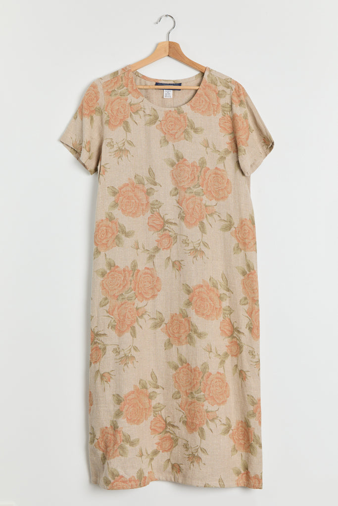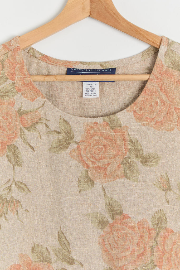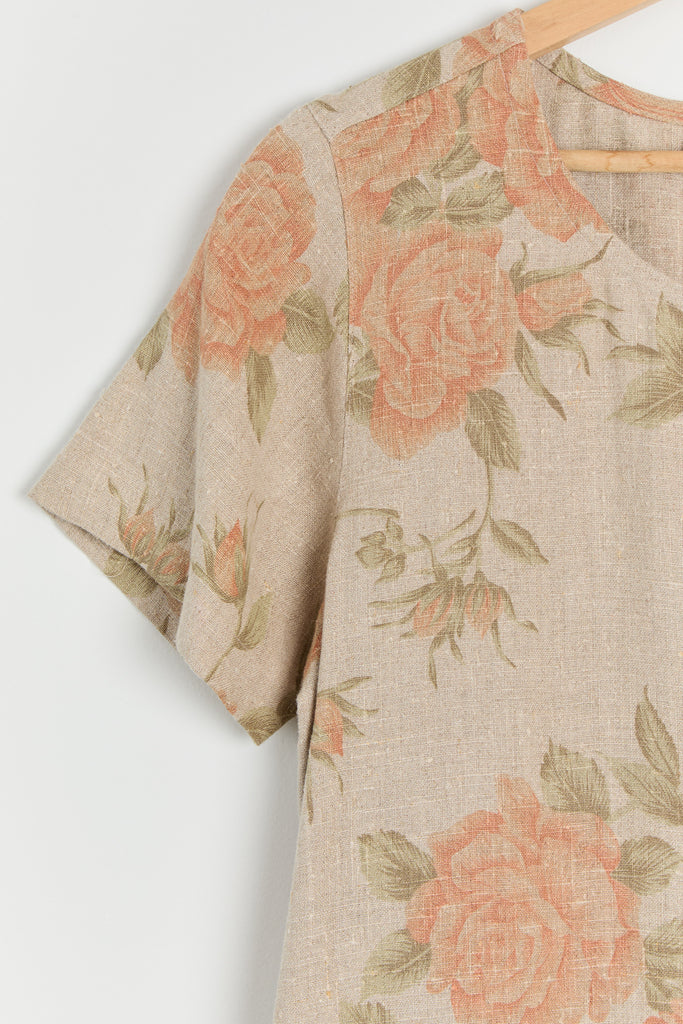 90s Taupe Orange Floral Print Linen Dress M/L