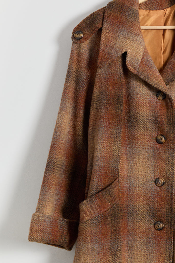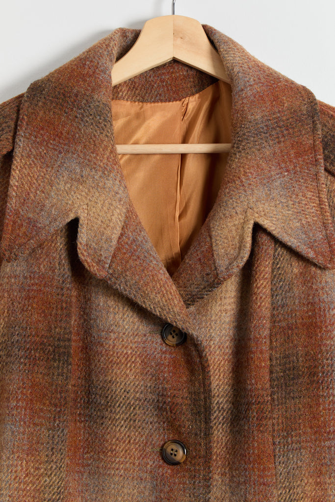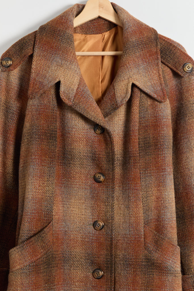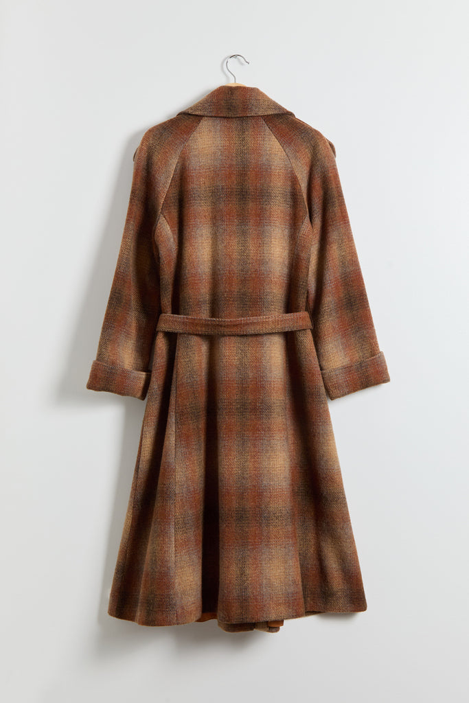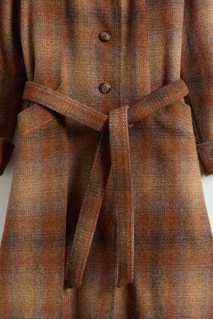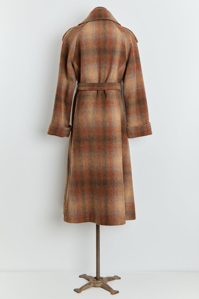70s Brown Wool Plaid Long Wrap Coat M/L