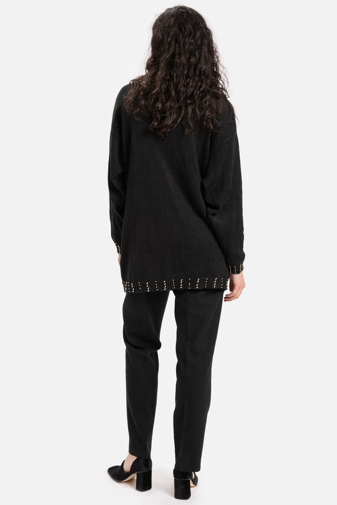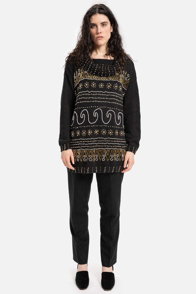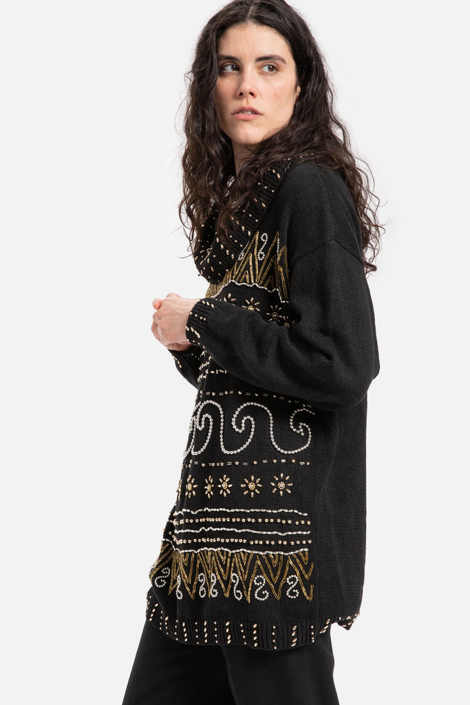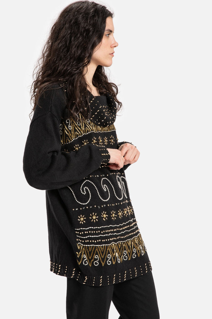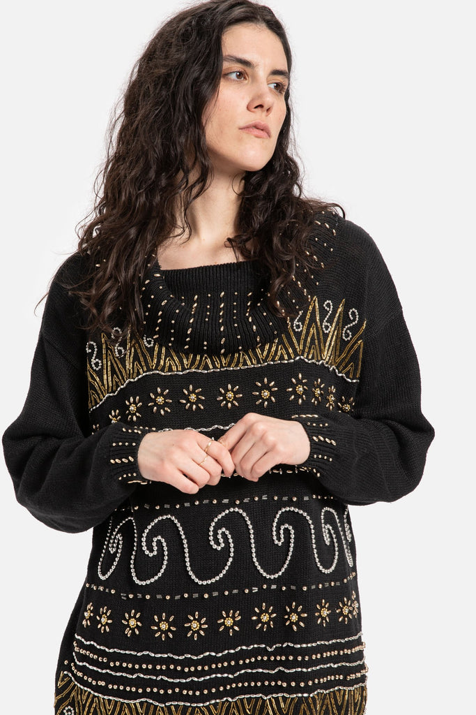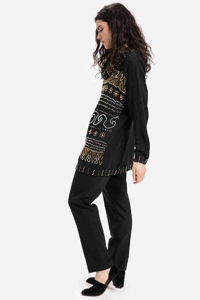 80s Black Embellished Metallic Bead Cowl Sweater L