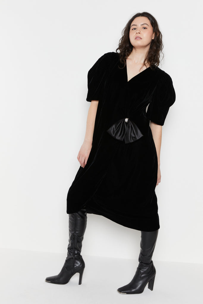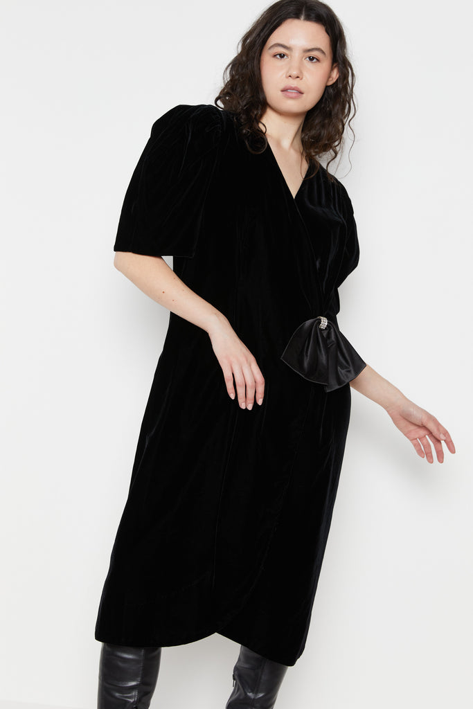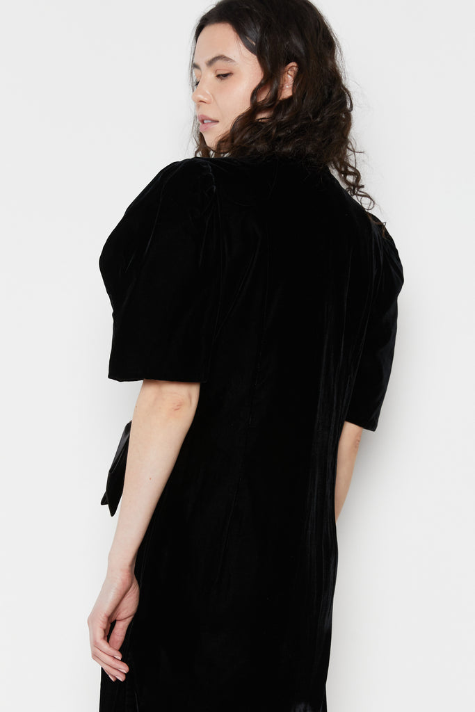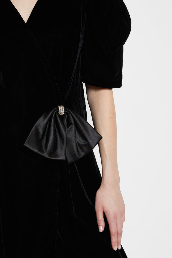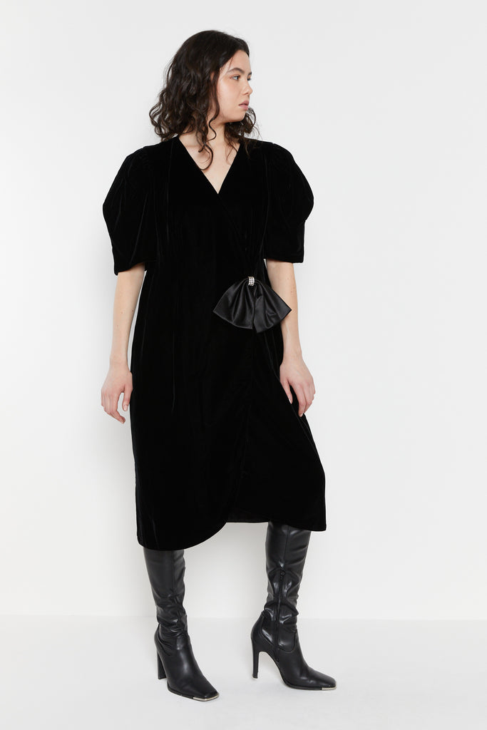 80s Black Puff Sleeve Velvet Asymmetrical Bow Dress L