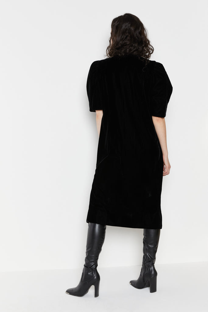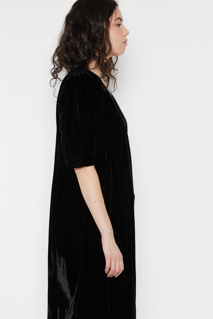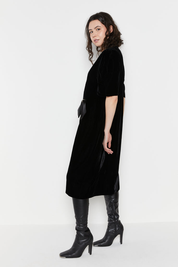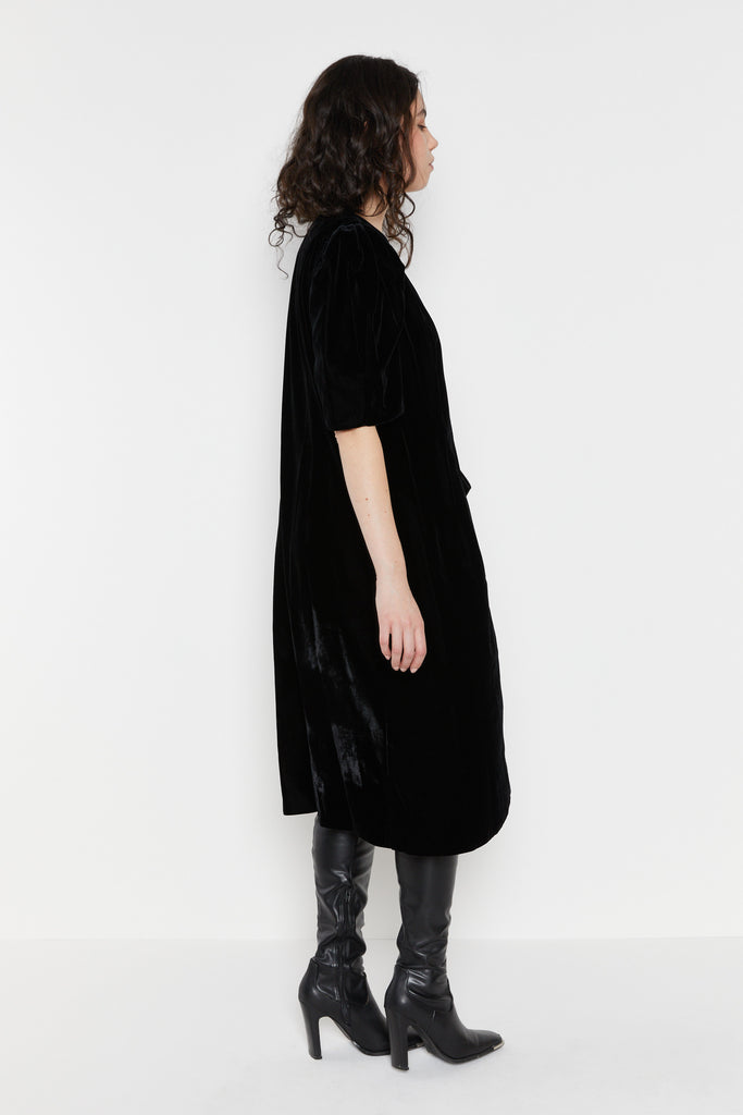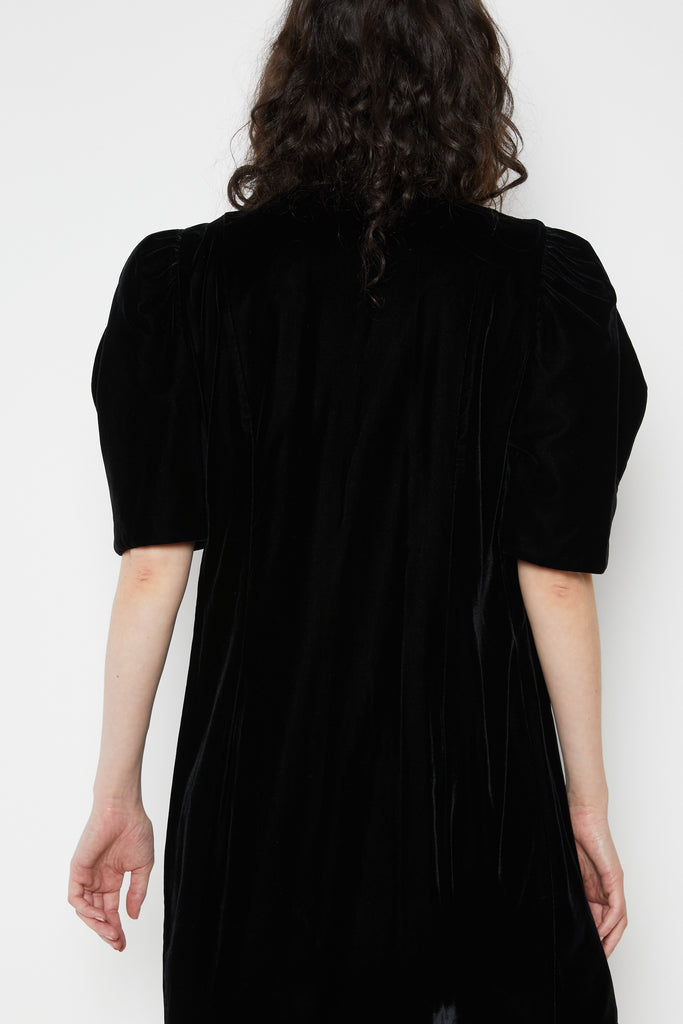 80s Black Puff Sleeve Velvet Asymmetrical Bow Dress L