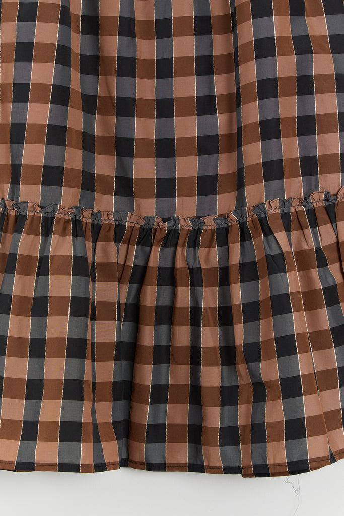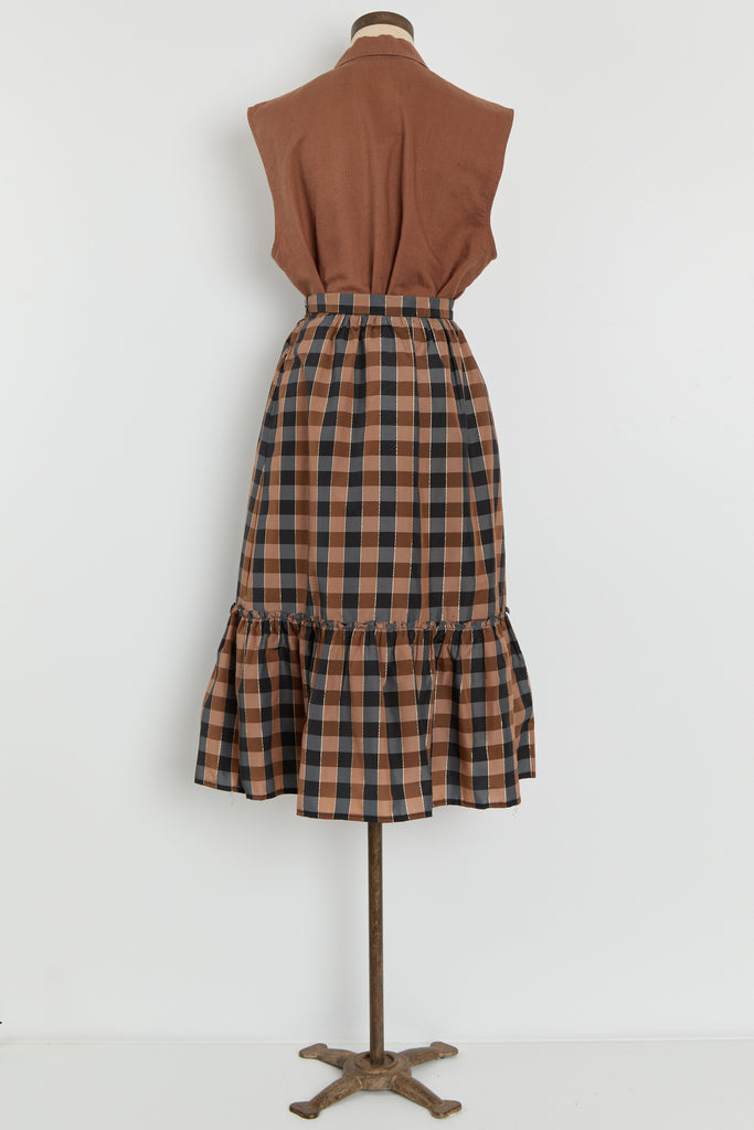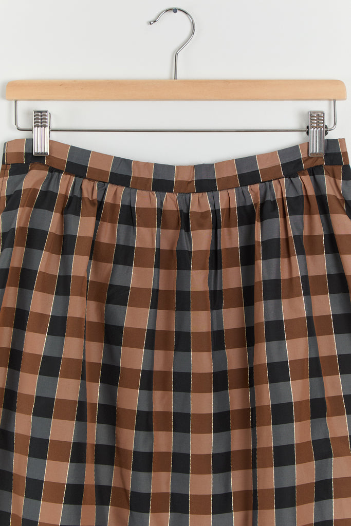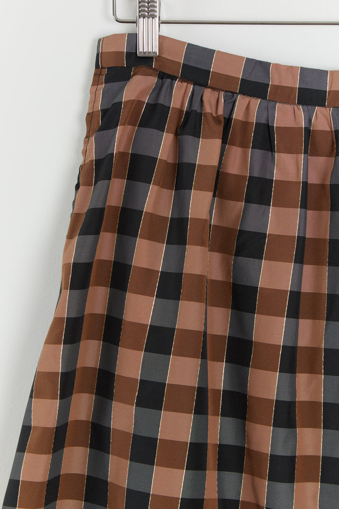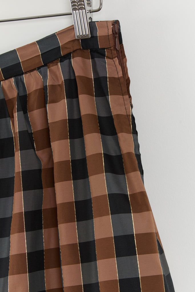 80s Brown Check Metallic Taffeta Ruffle Skirt L