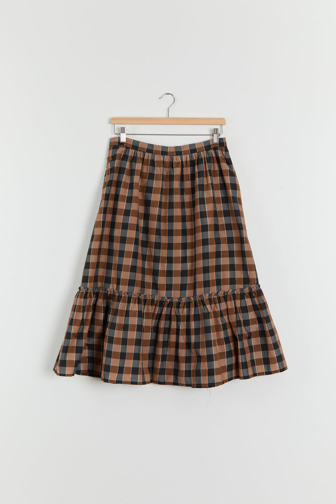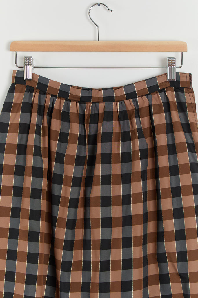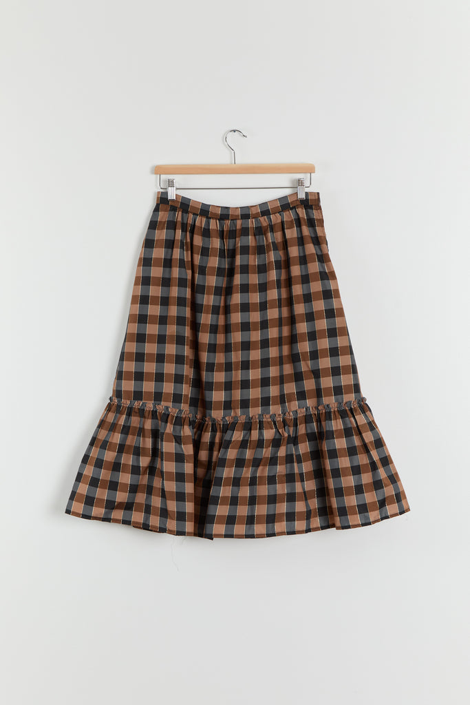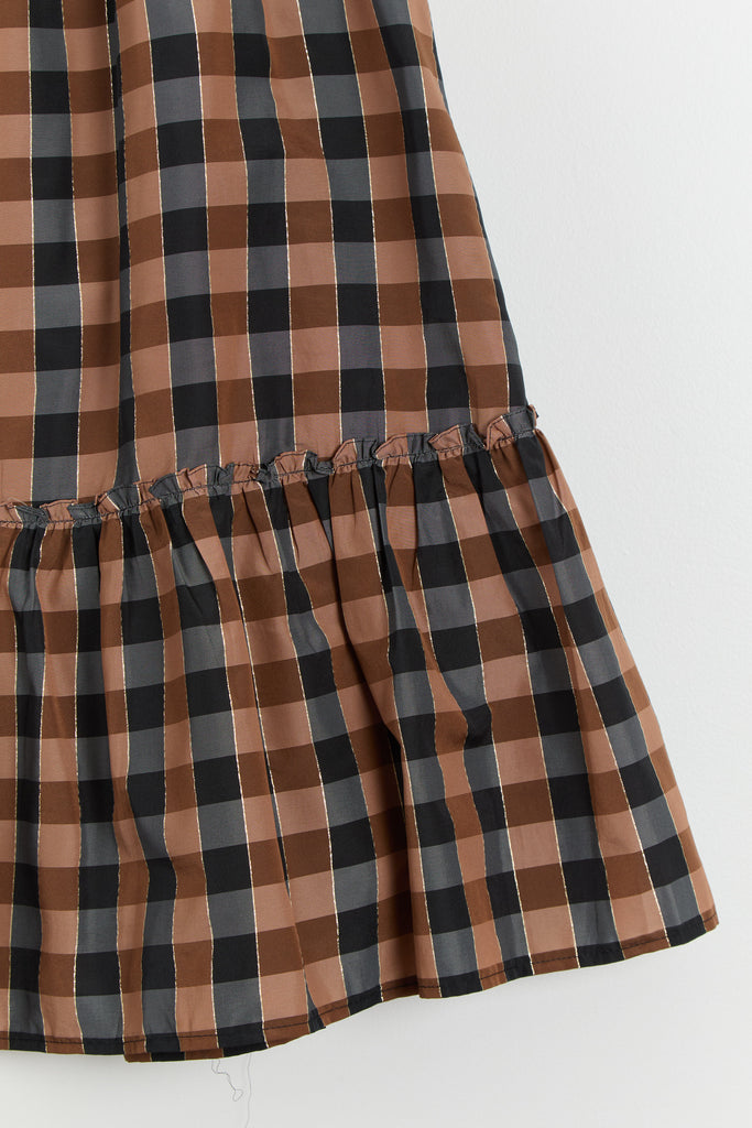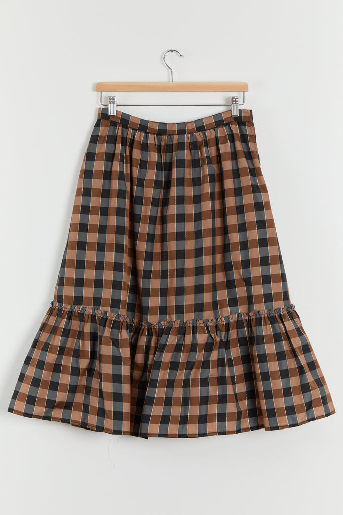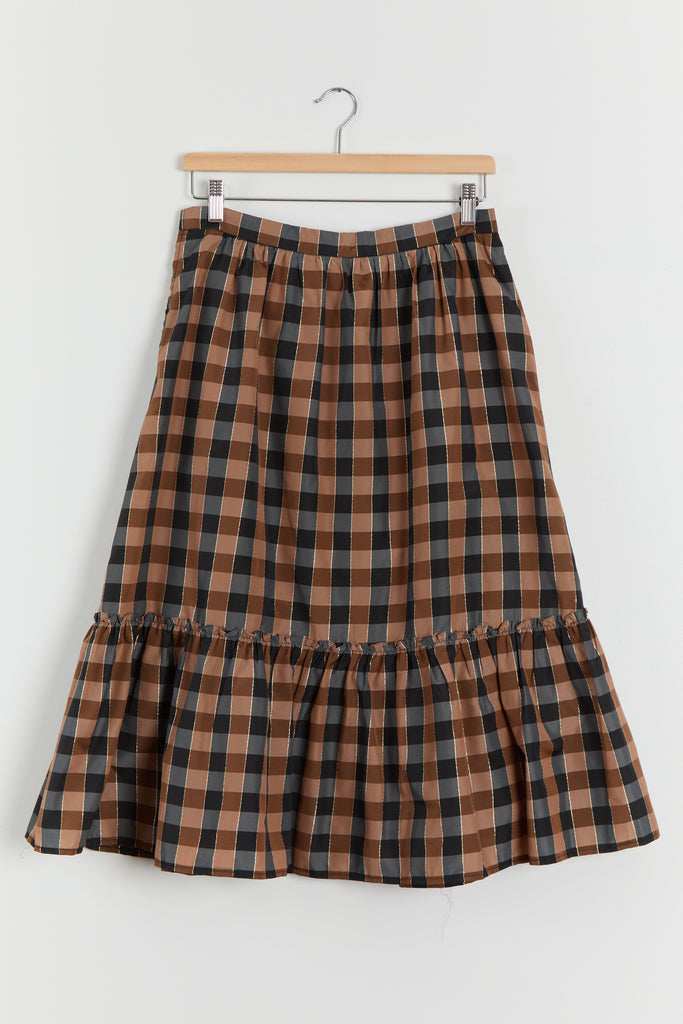 80s Brown Check Metallic Taffeta Ruffle Skirt L