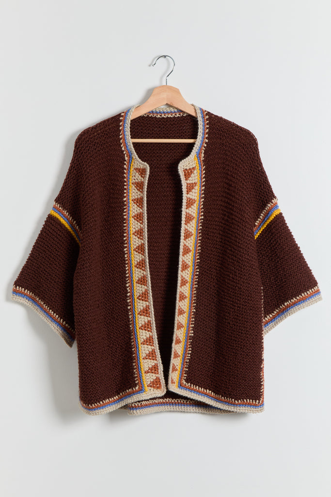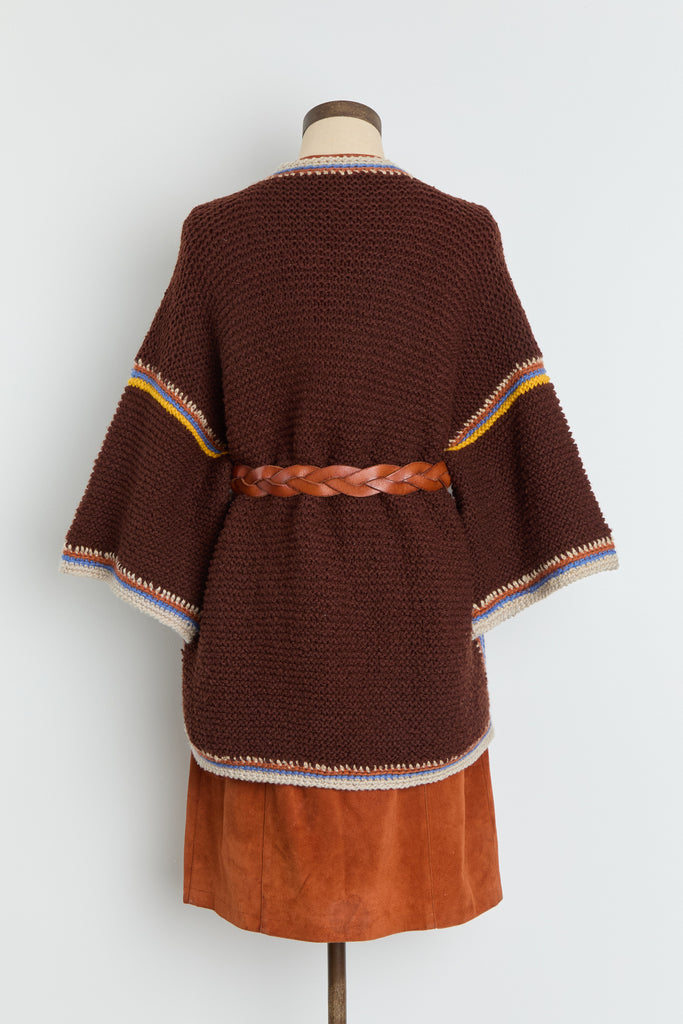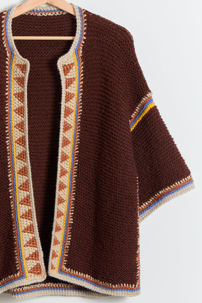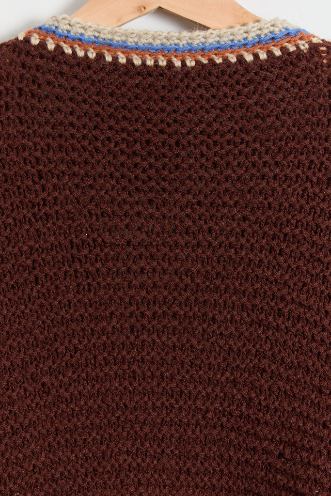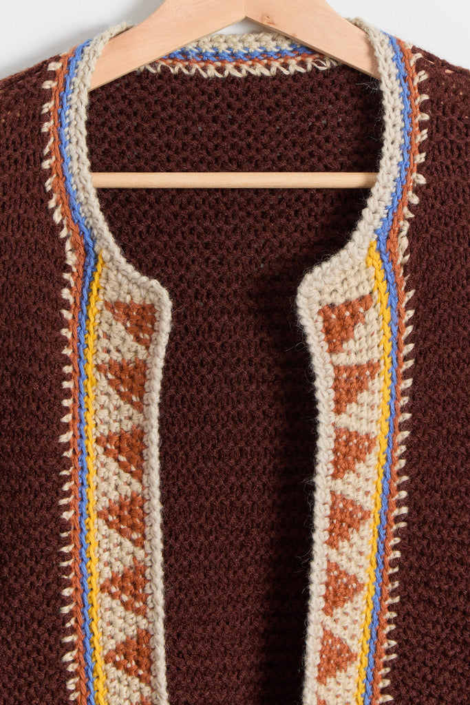70s Brown Geo Trim Chunky Open Cardigan L/XL