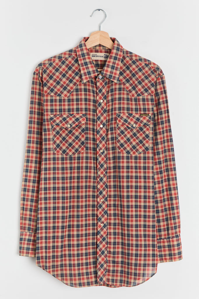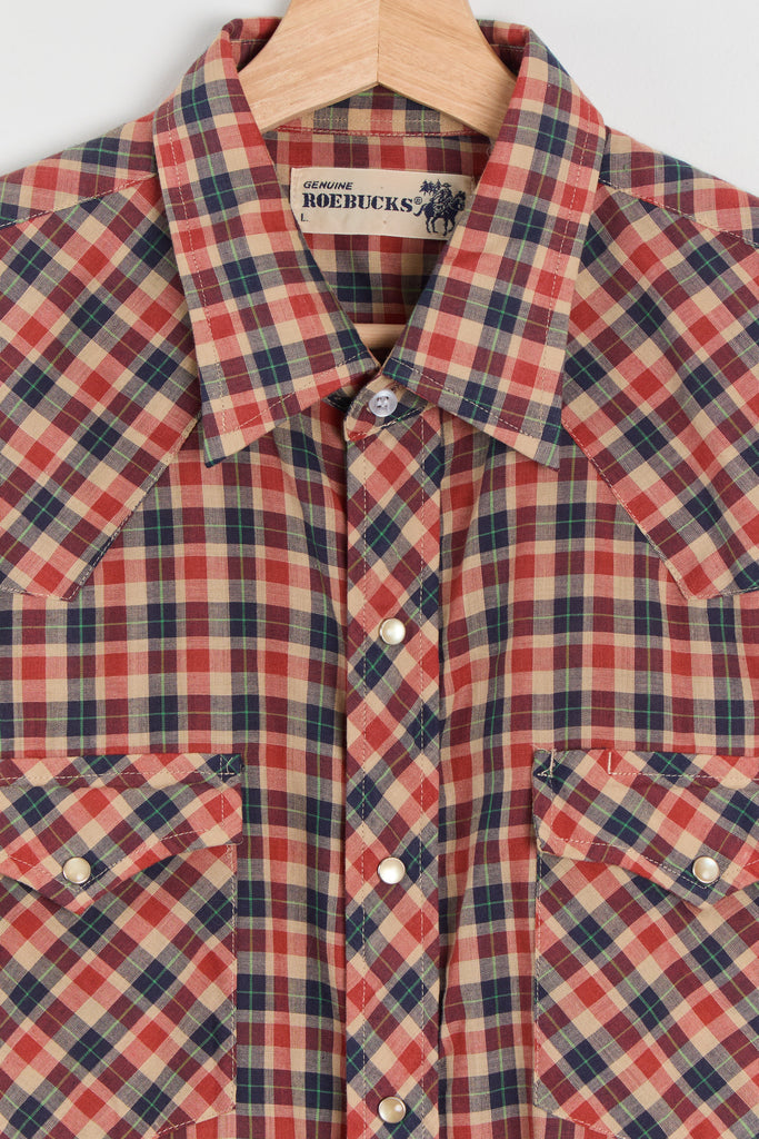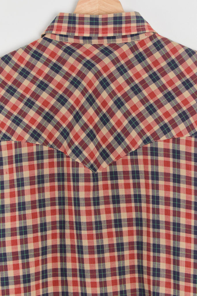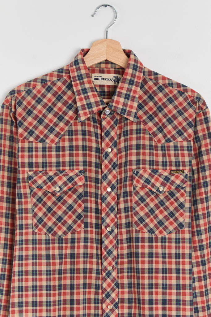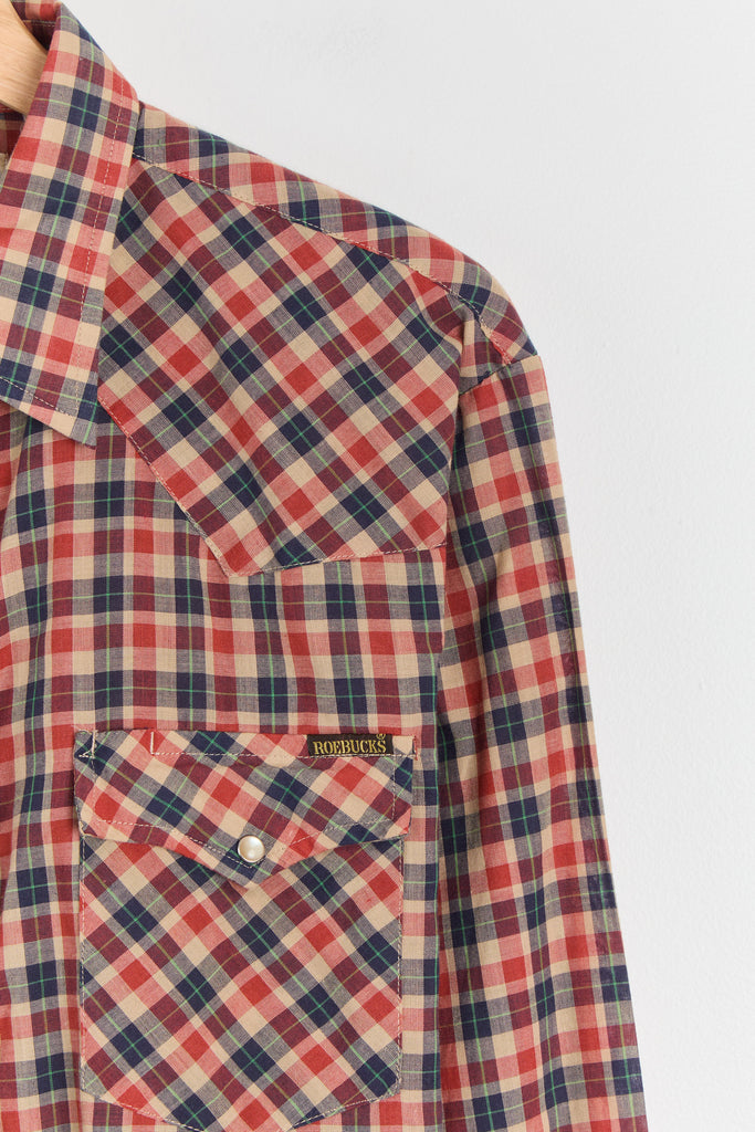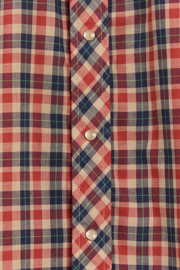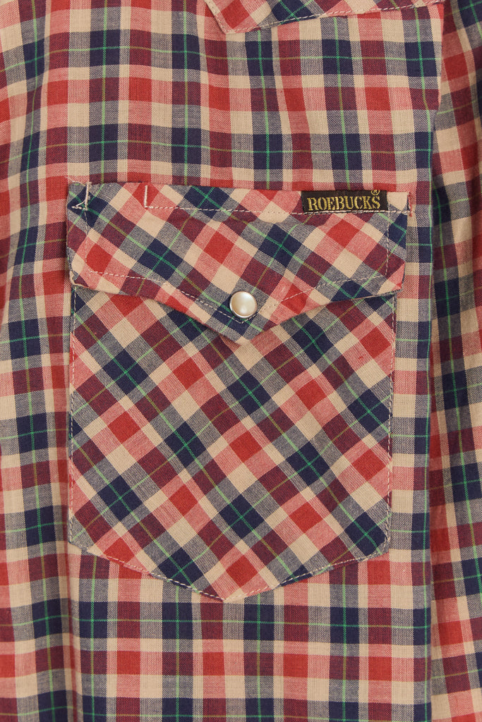 70s Red Navy Plaid Western Pearl Snap Shirt L/XL