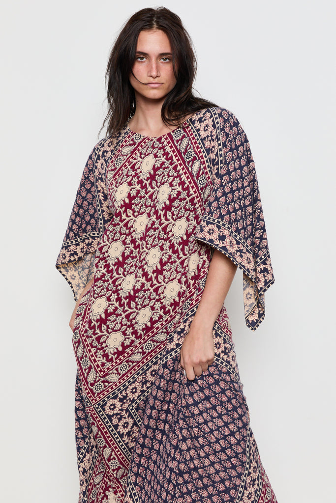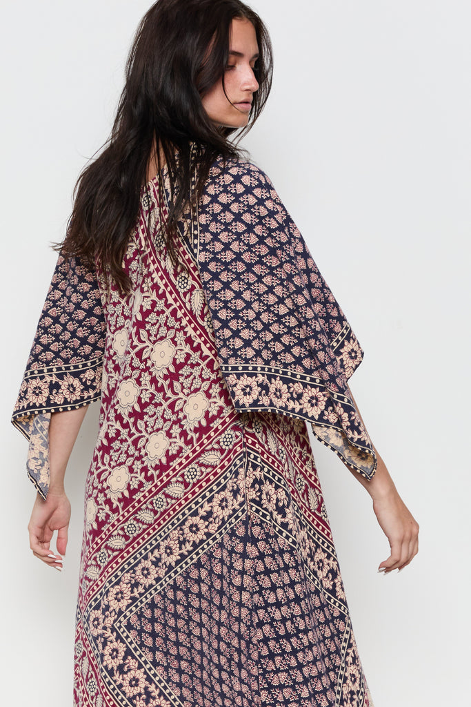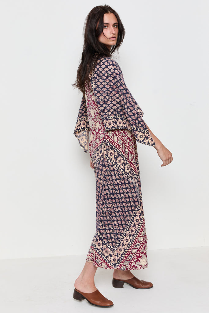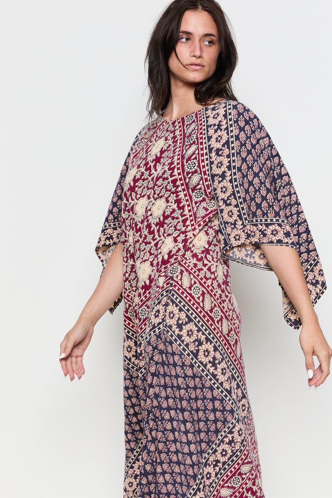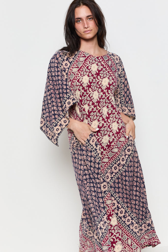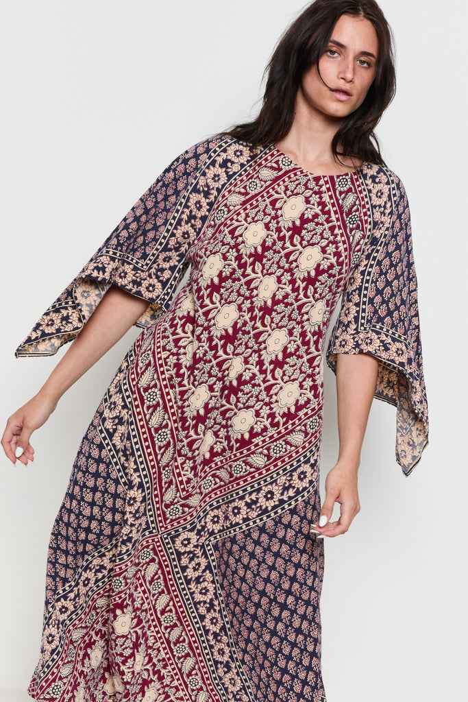 70s Navy Burgundy Handkerchief Boho Dress M/L