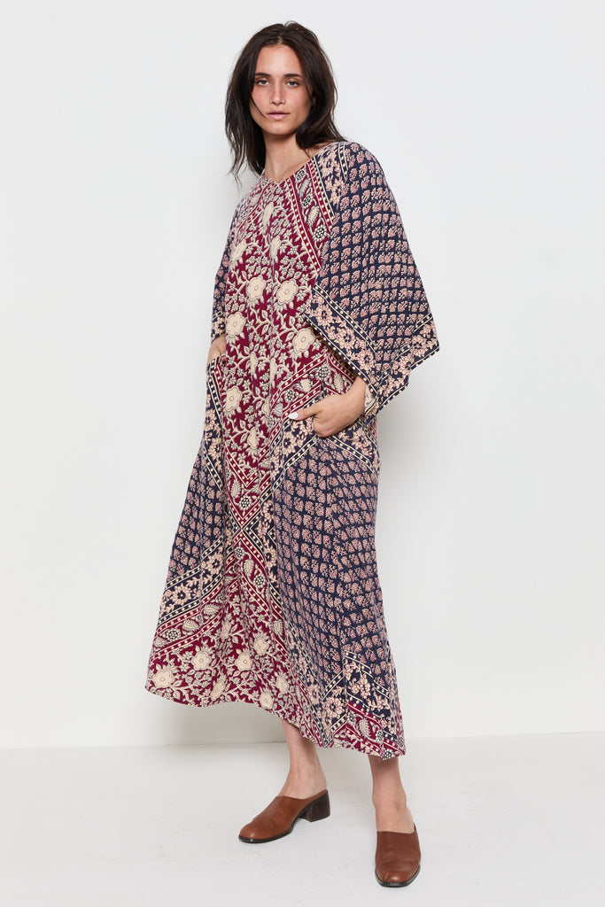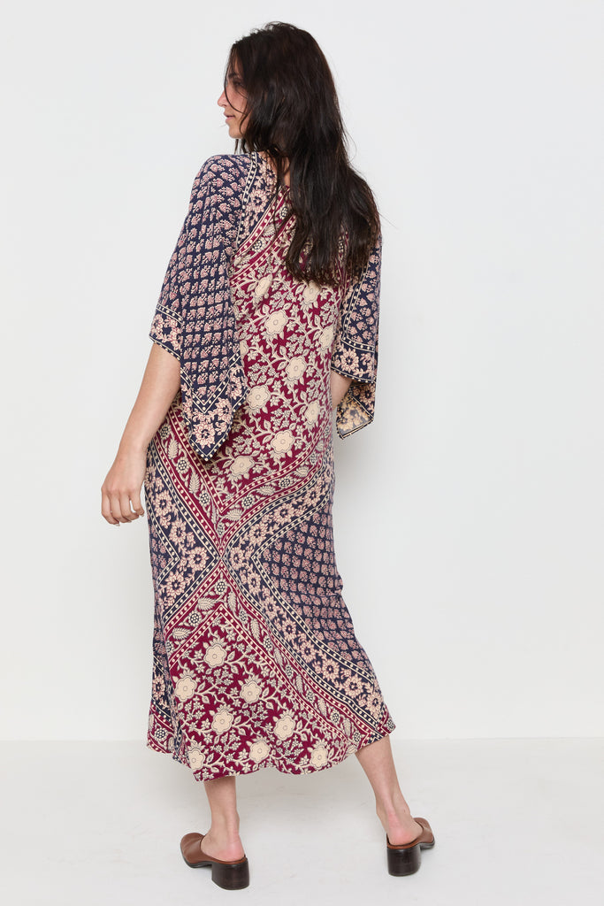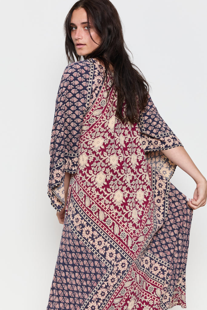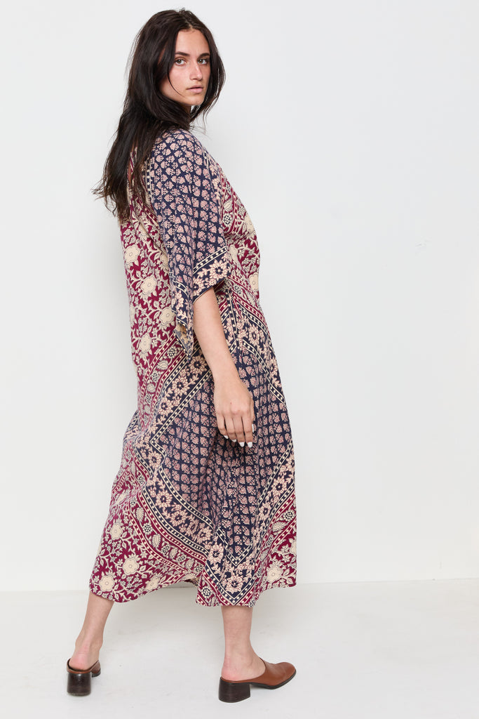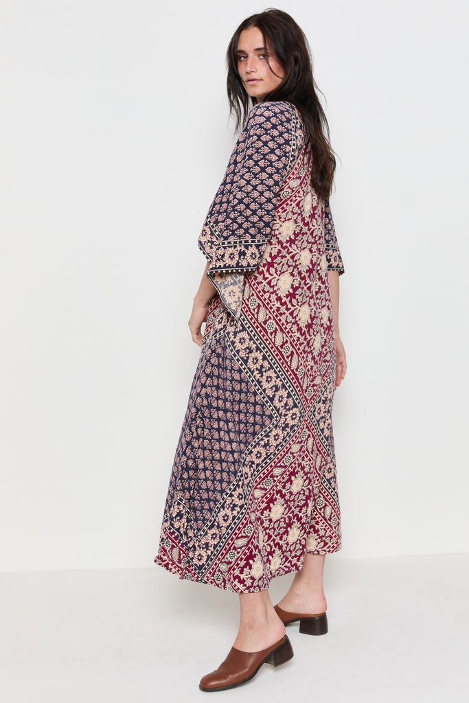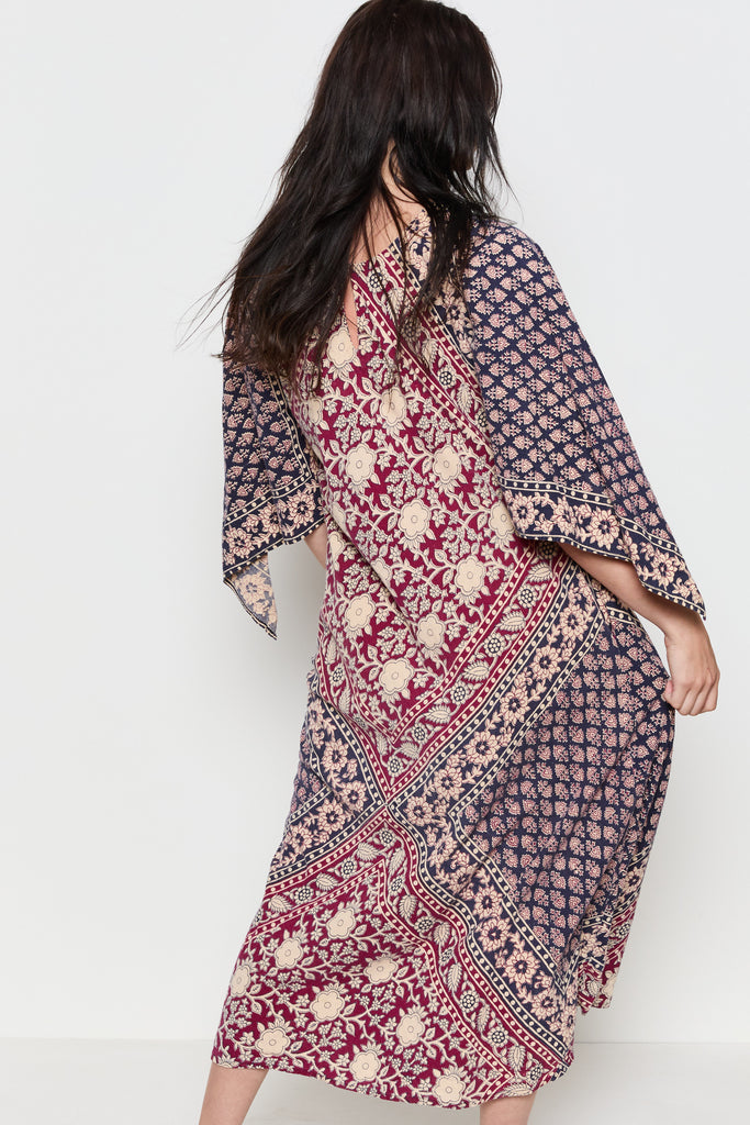 70s Navy Burgundy Handkerchief Boho Dress M/L