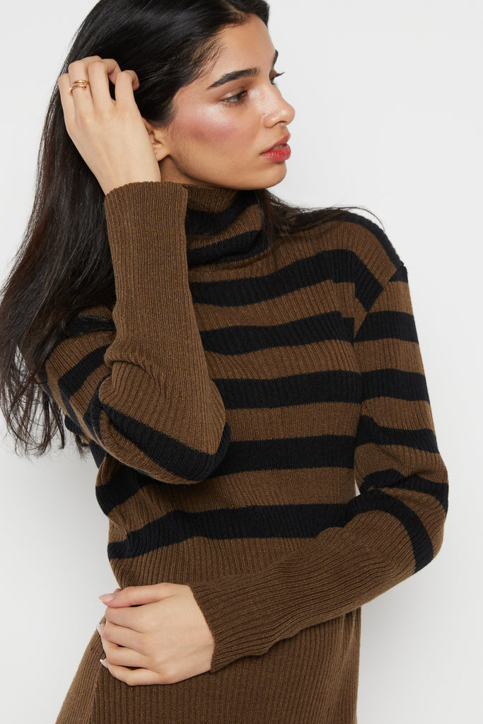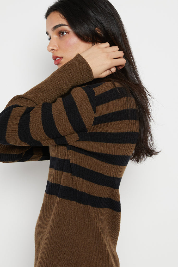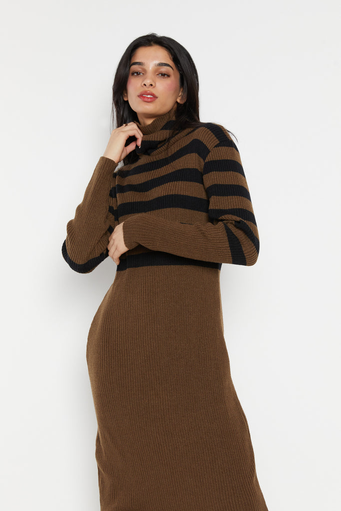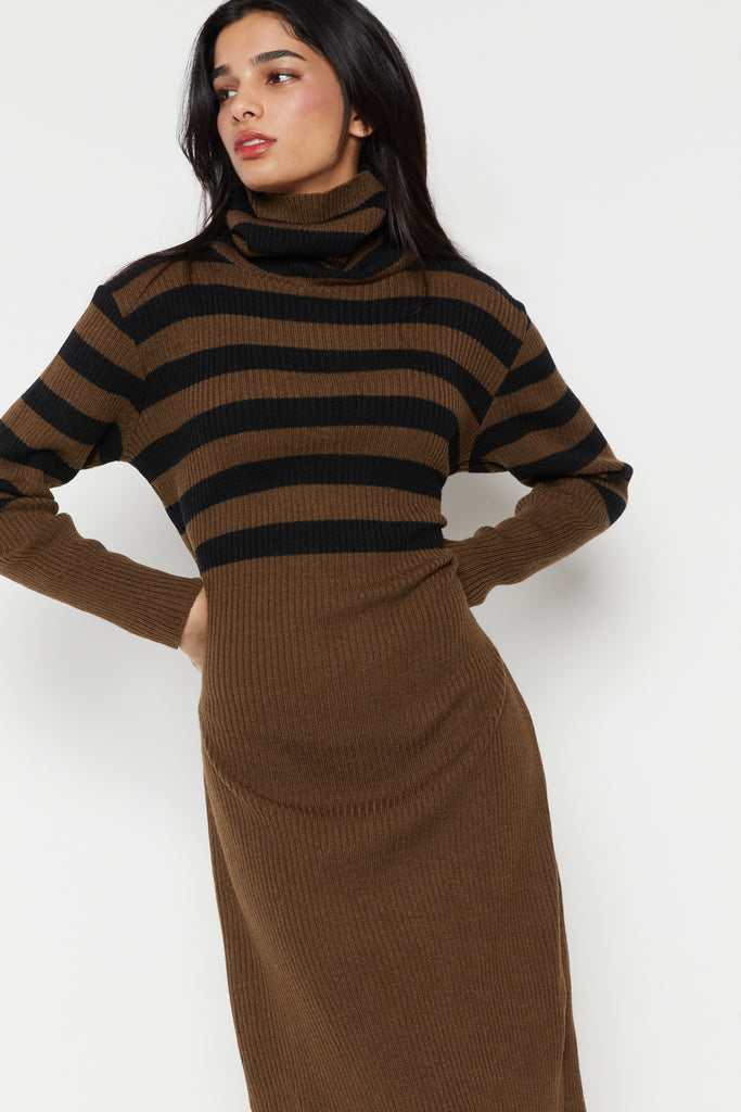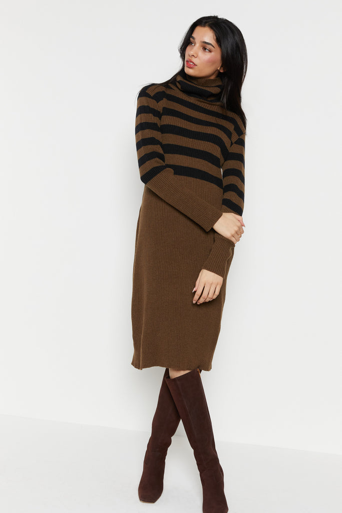 70s Olive Ribbed Stripe Sweater Dress L