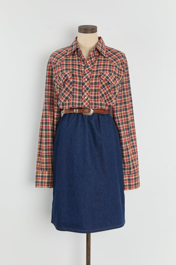 70s Red Navy Plaid Western Pearl Snap Shirt L/XL