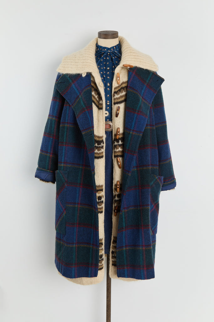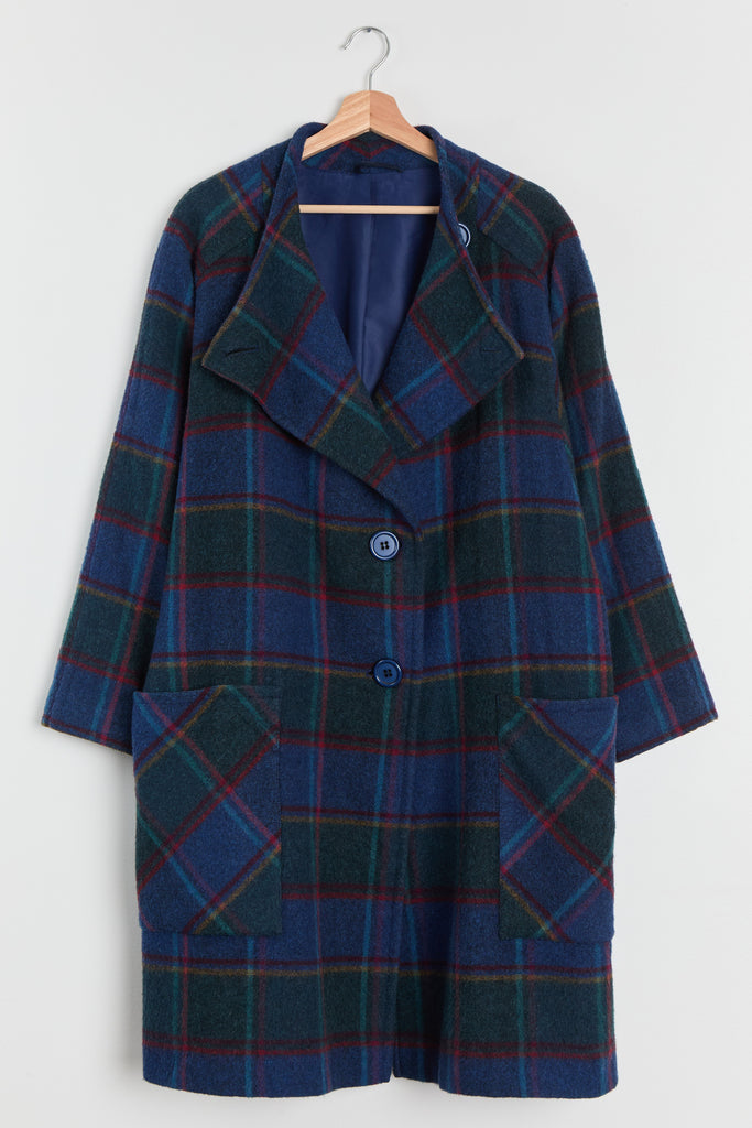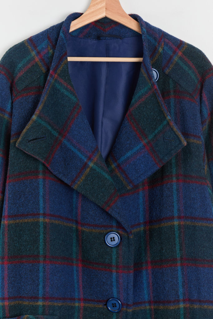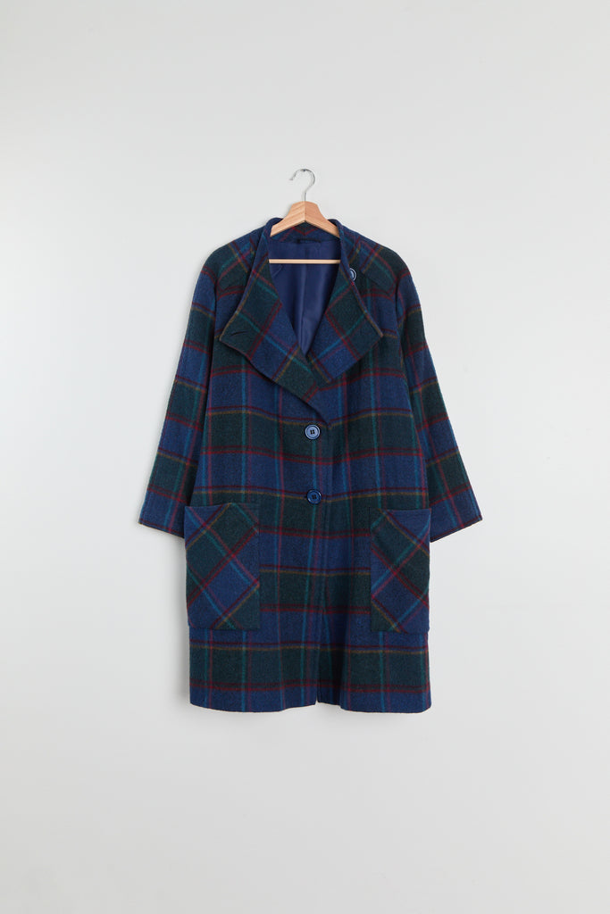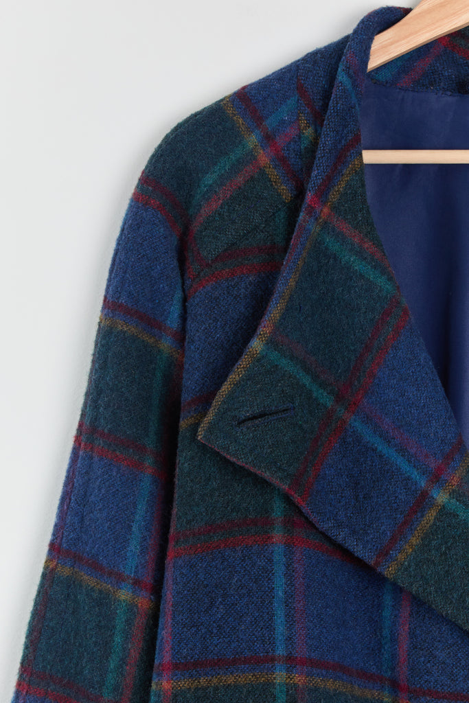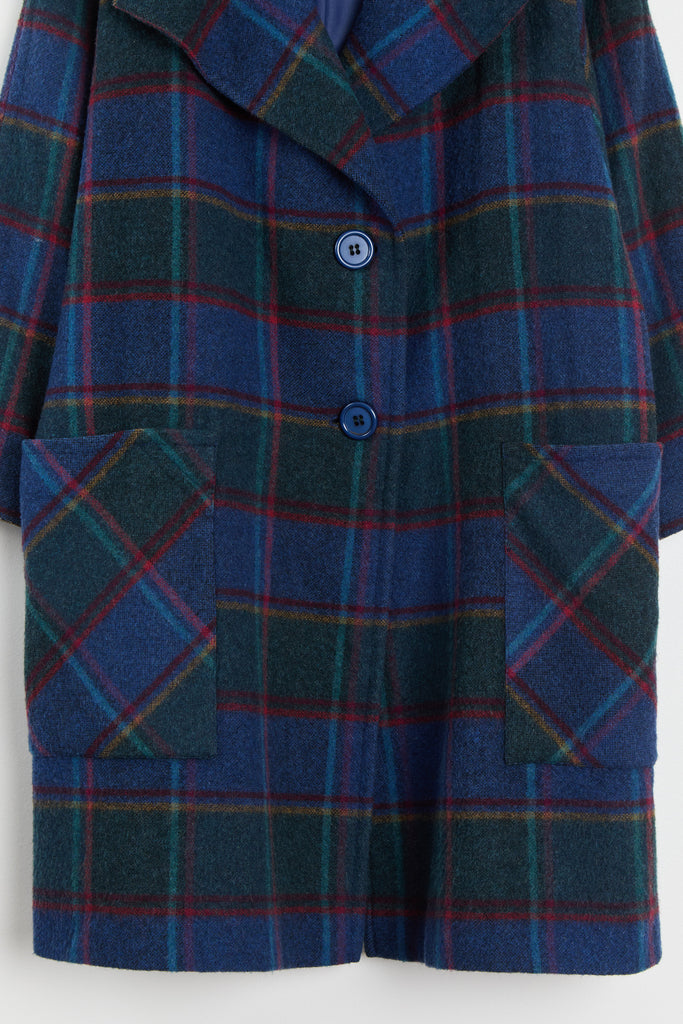 80s Blue Forest Plaid Batwing Pocket Coat L