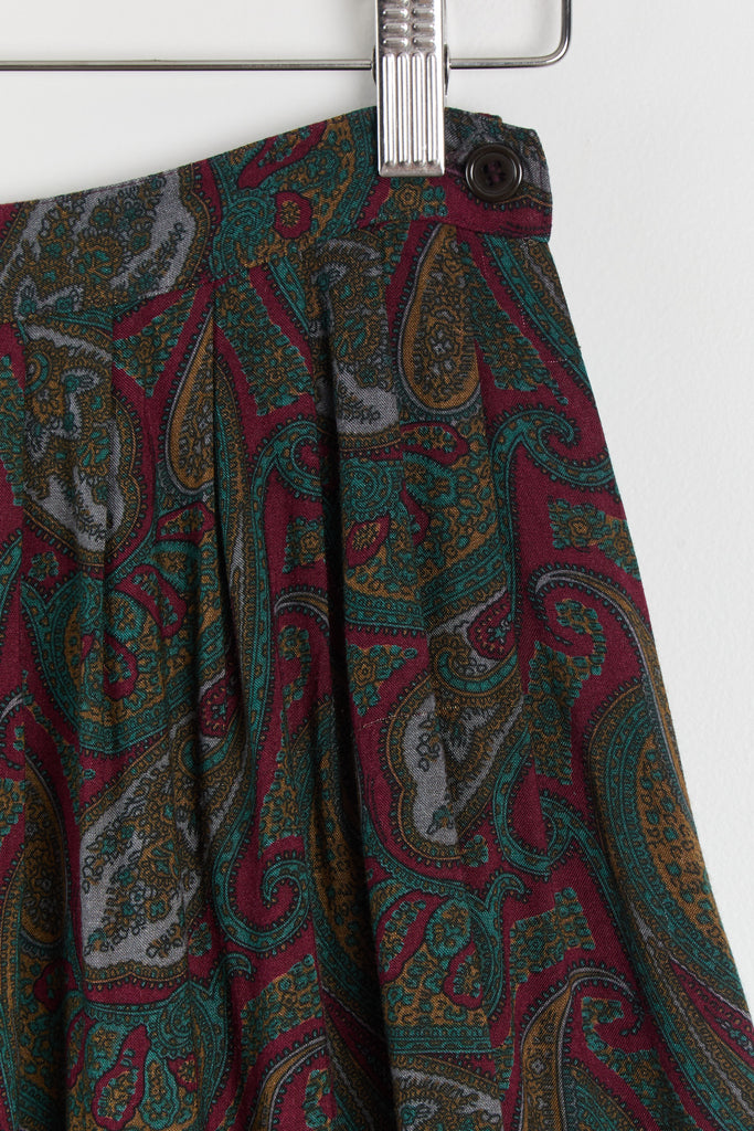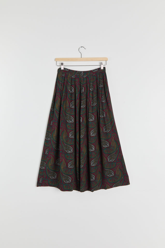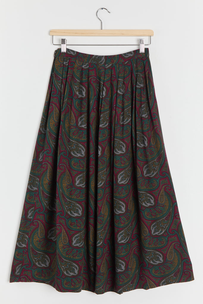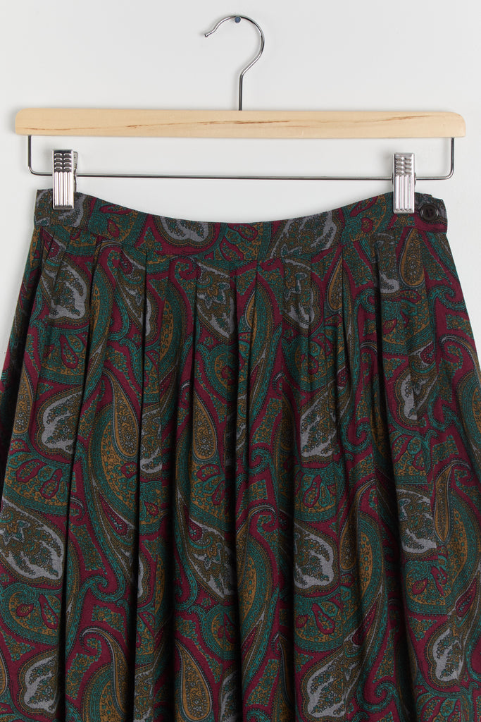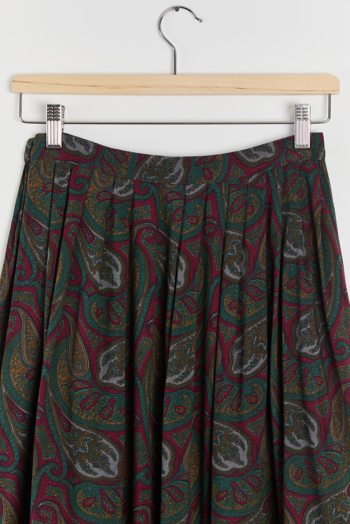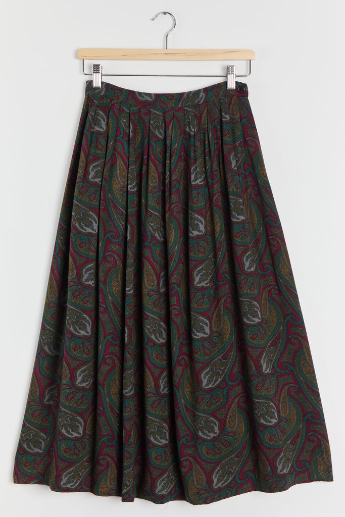 80s Wine Paisley Pleated Midi Skirt S
